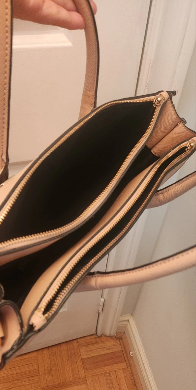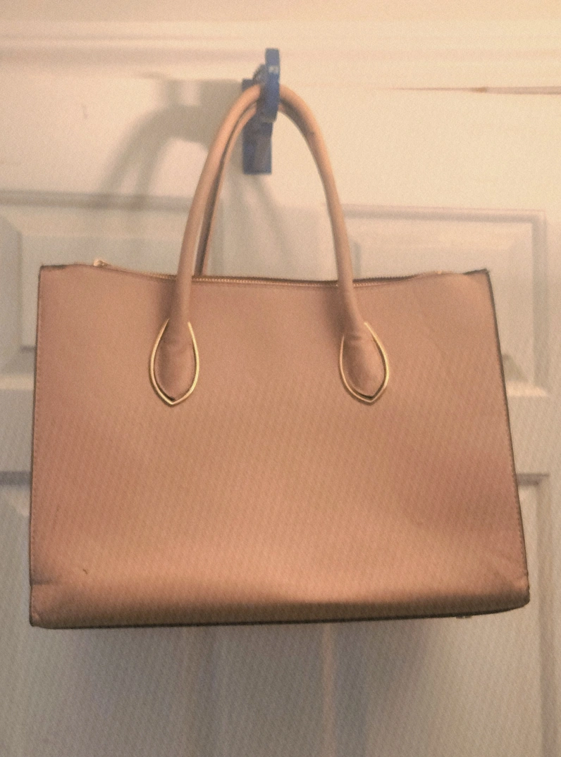 A beige tote bag from H&M. It has a spacious interior with multiple compartments and gold zippers. Perfect for everyday use!