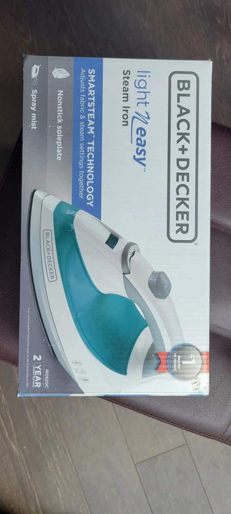 I'm selling a brand new BLACK+DECKER Light 'N Easy steam iron! It's still in the box with all the original components. Features include: - SmartSteam Technology adjusts fabric and steam settings together - Nonstick soleplate - Spray mist - Anti-drip - Translucent water tank - Fabric guide - 360° pivoting cord