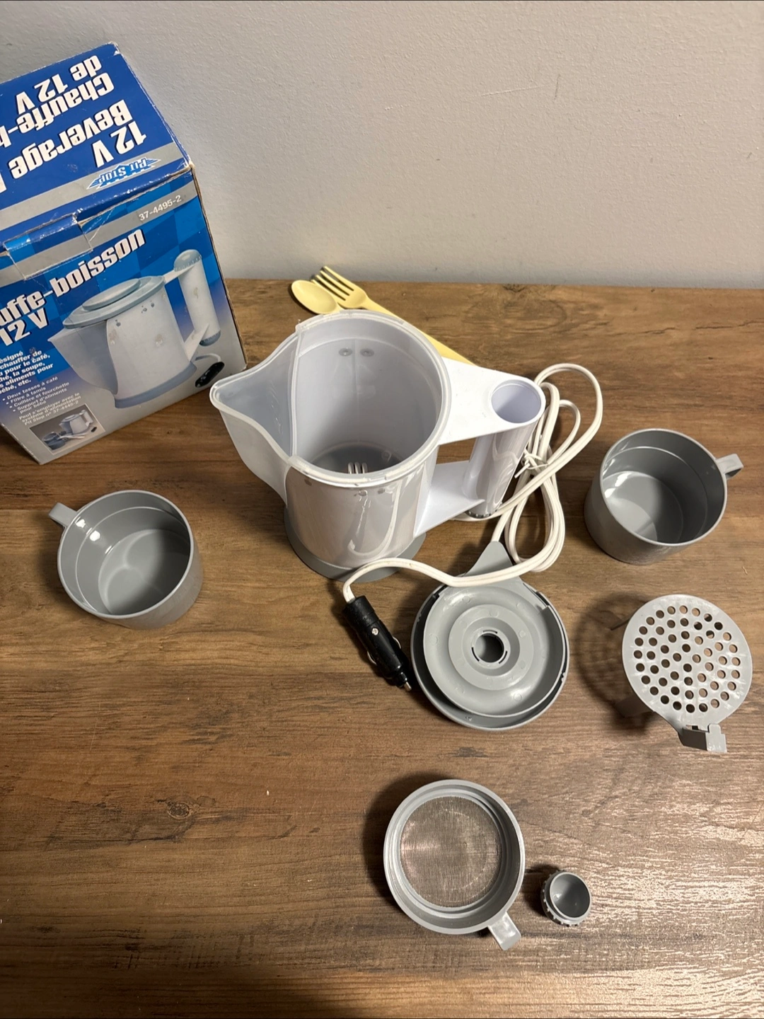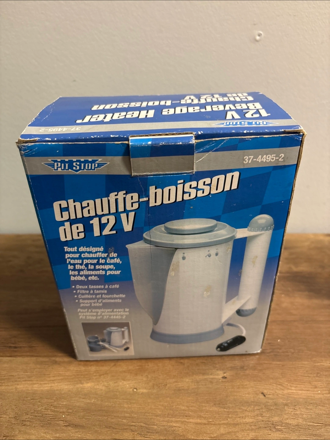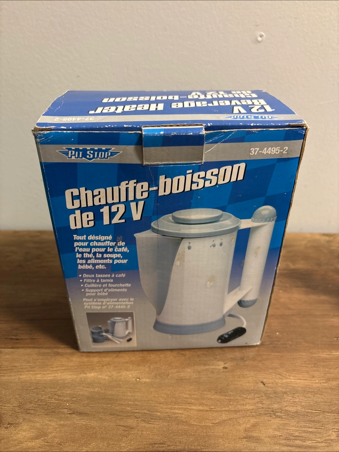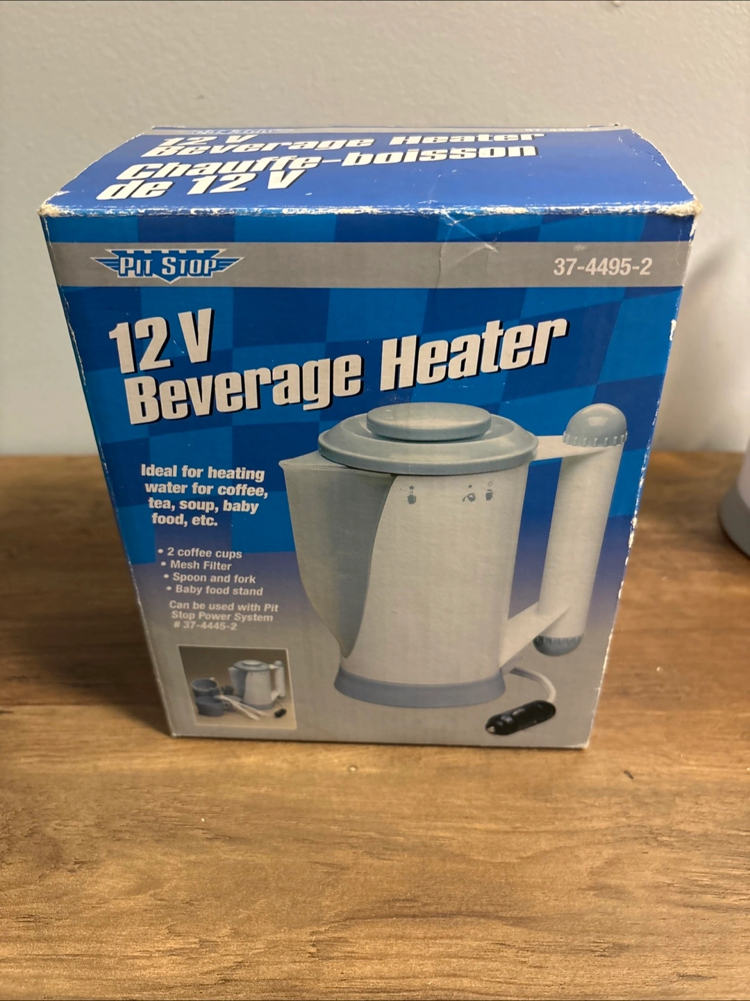Selling a Pit Stop 12V Beverage Heater, still in its original box! It's perfect for heating water for coffee, tea, soup, or baby food. The box includes two coffee cups, a filter, a spoon and fork, and a baby food stand. A handy item to have!