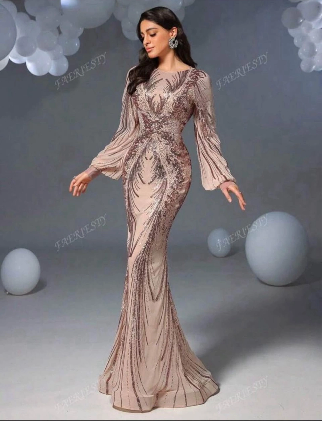 This is a beautiful sequin mermaid formal dress. It features long sleeves and a flattering silhouette. Perfect for a special occasion!