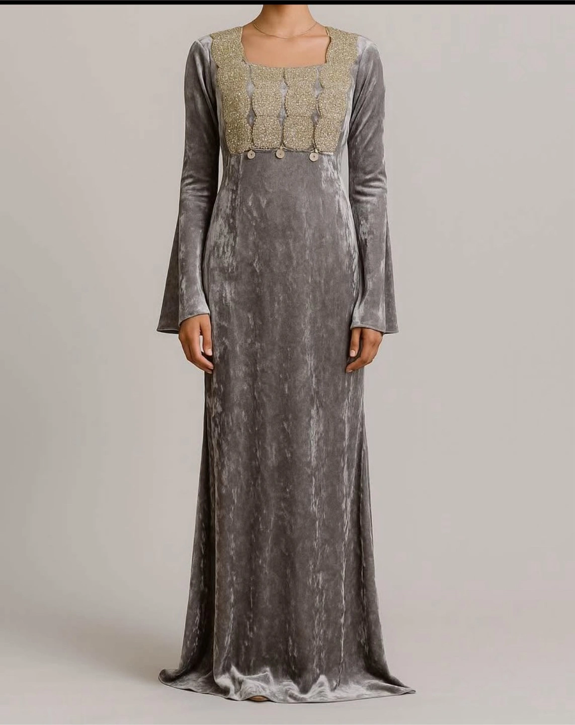 Beautiful grey velvet maxi dress with long, bell sleeves. The neckline has a gold beaded detail. Perfect for a special occasion or a night out!