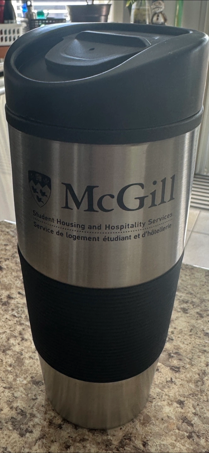 Stainless steel travel mug with the McGill University logo. Perfect for keeping your coffee or tea hot on the go! **Free with purchase**