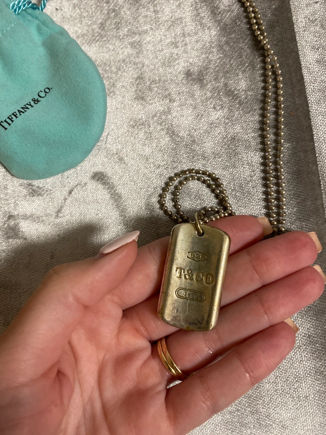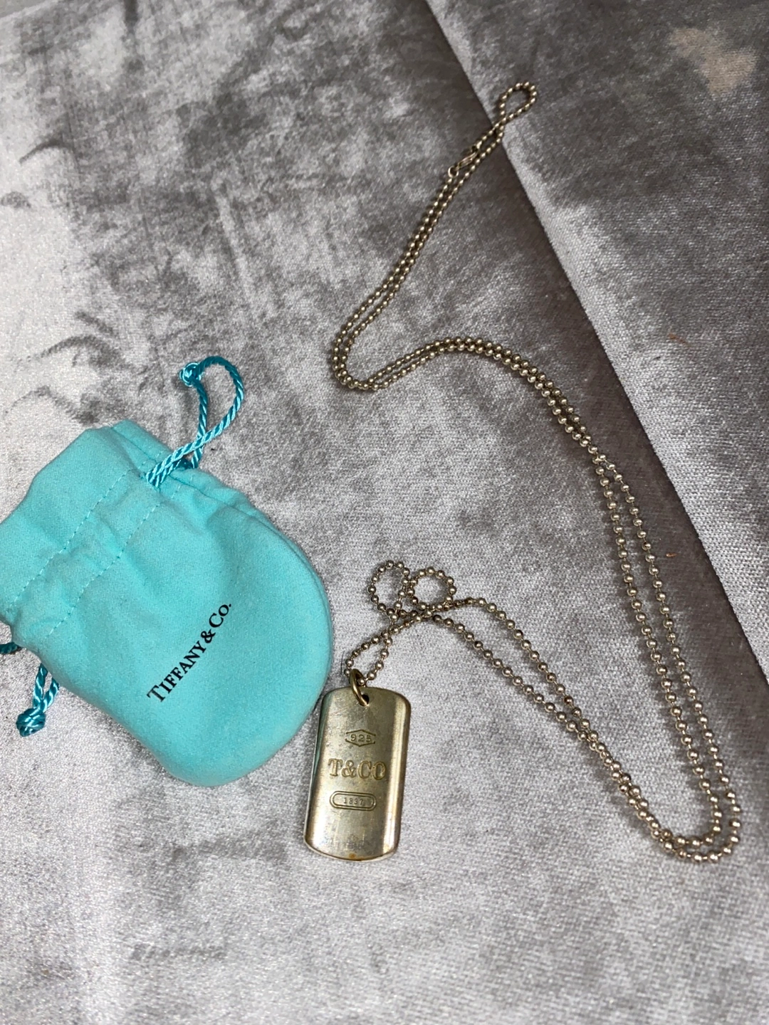 Selling a Tiffany & Co. 1837 dog tag necklace in sterling silver. It comes with its original pouch. Needs to be cleaned. The chain is long but it’s super trendy and cute layered with other pieces or on its own. **Authentic