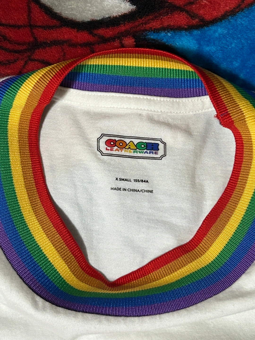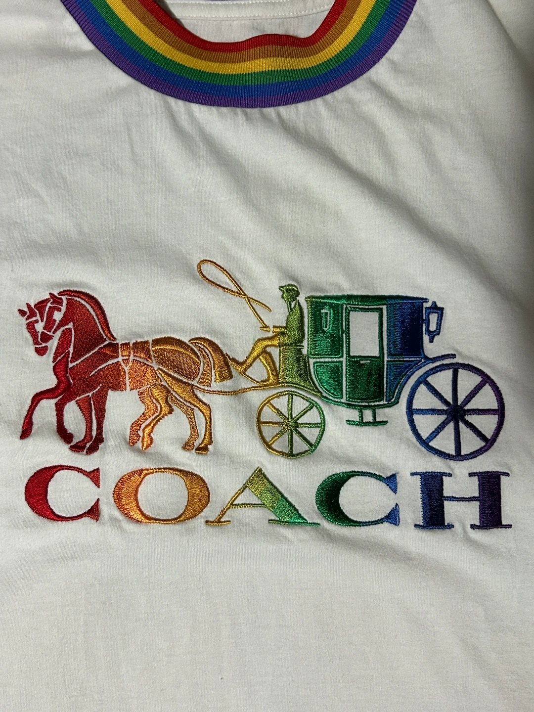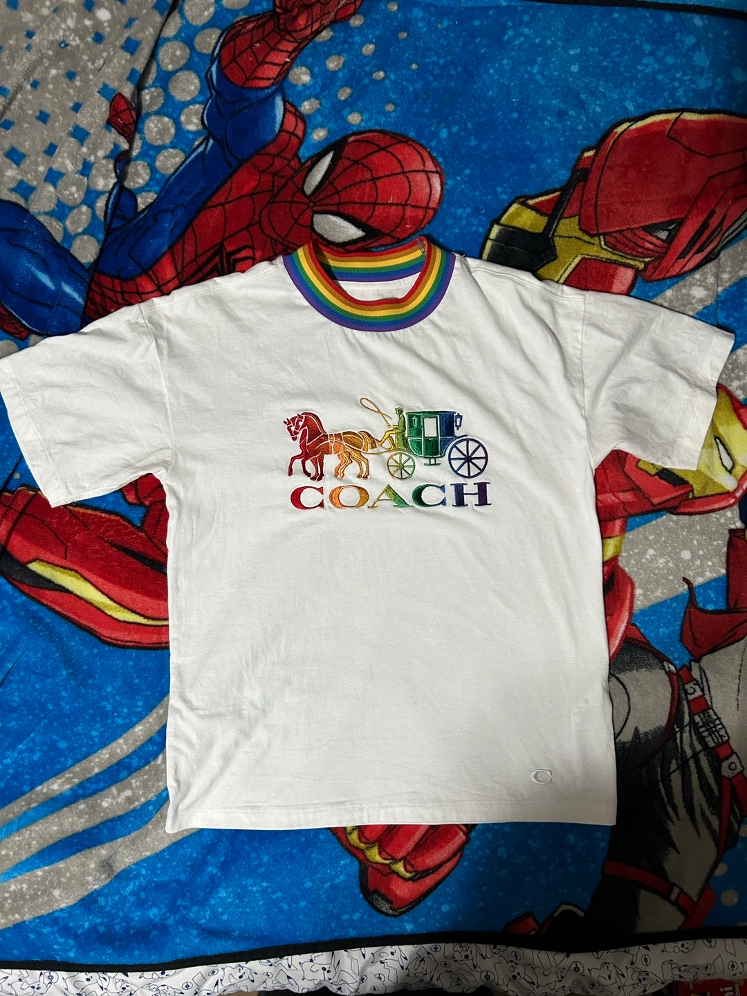 Authentic Signature coach rainbow collar tee. Front rainbow coach logo embroidery. In nearly perfect condition with very little to zero wear. Made from 100% cotton. Would be happy to provide measurements for best fit!