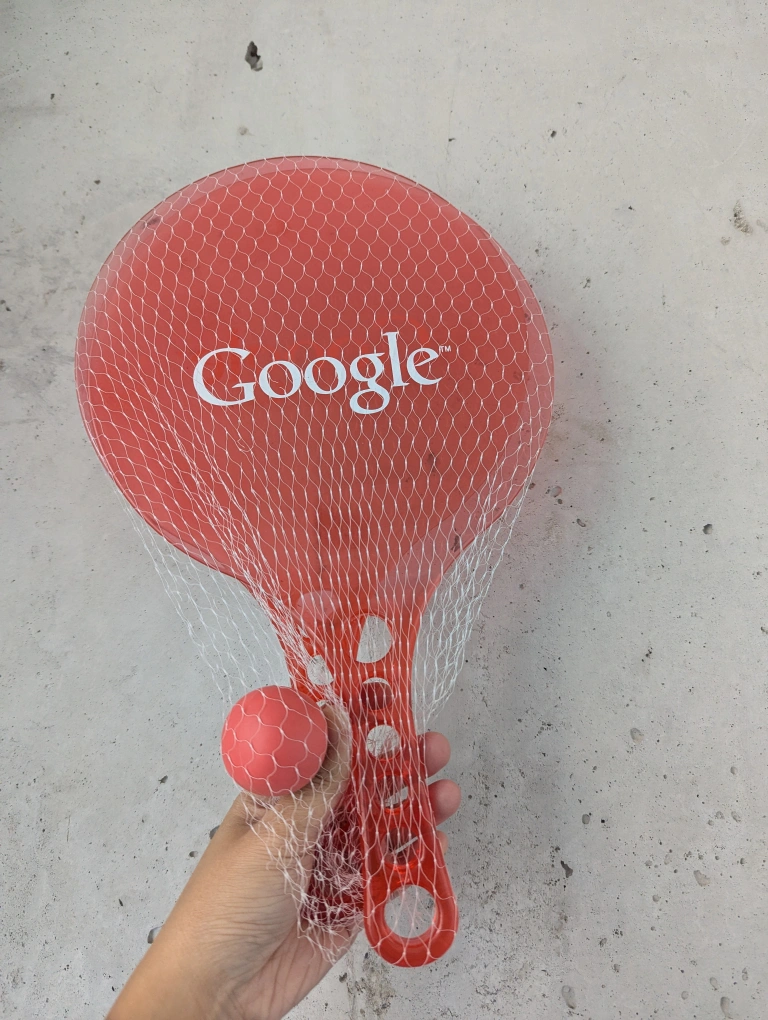 Giving away a Google beach paddle ball set! This set includes two paddles and a ball, all in a vibrant red colour. Perfect for some fun in the sun at the beach or park. It's lightweight and portable, so you can easily bring it along on your next outdoor adventure