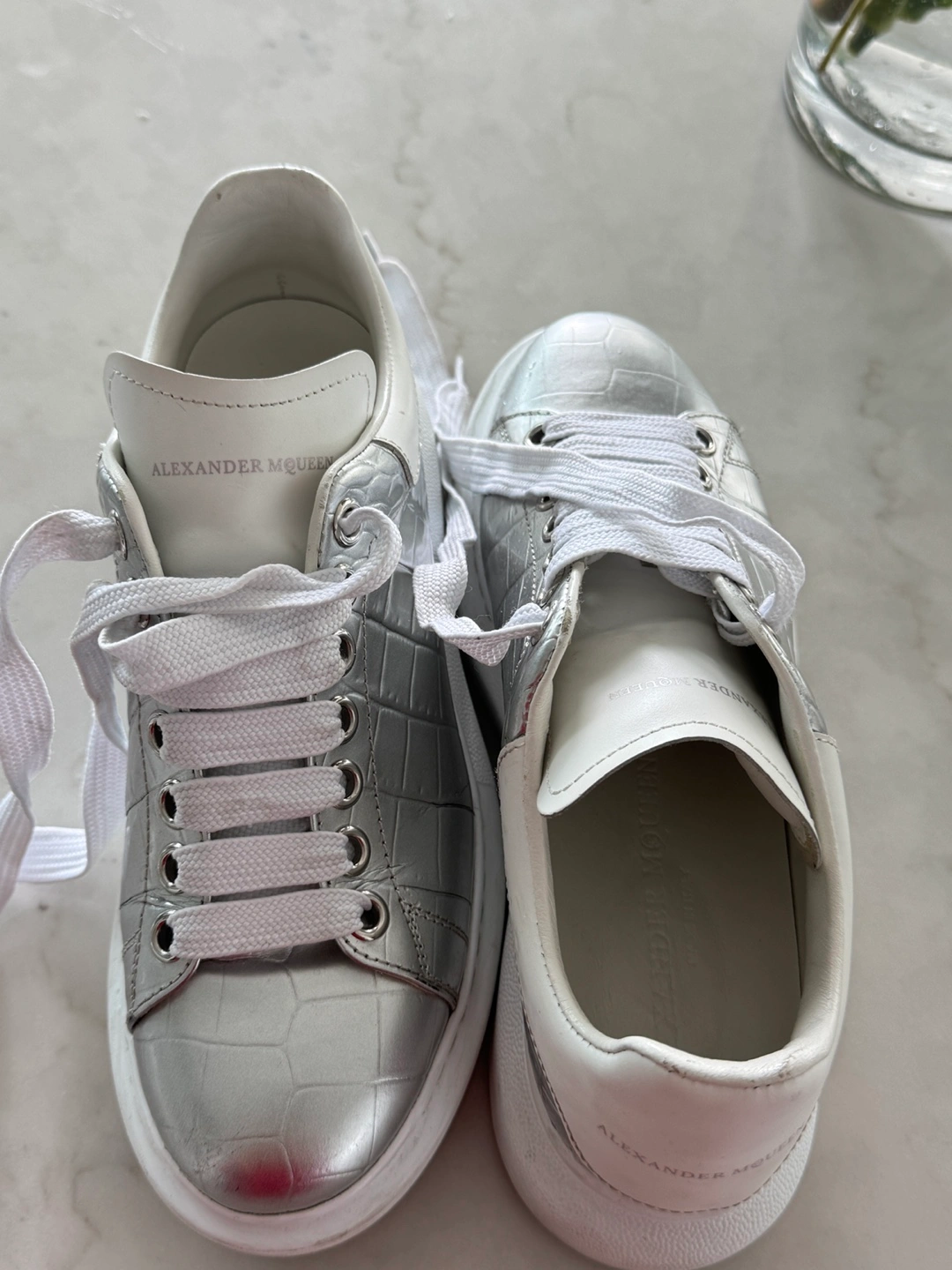 Selling a pair of Alexander McQueen sneakers in silver. The size is 37. They have a cool, distinctive design! Please take a look at the photos for condition.