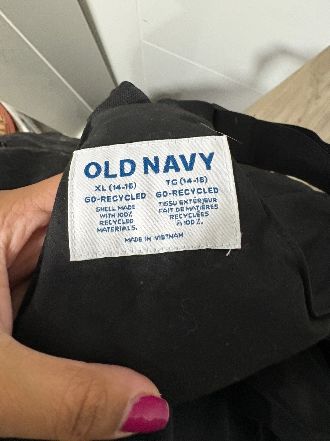 Selling a pair of Old Navy snow bibs in size XL (14-16). They're black and made with 100% recycled materials!