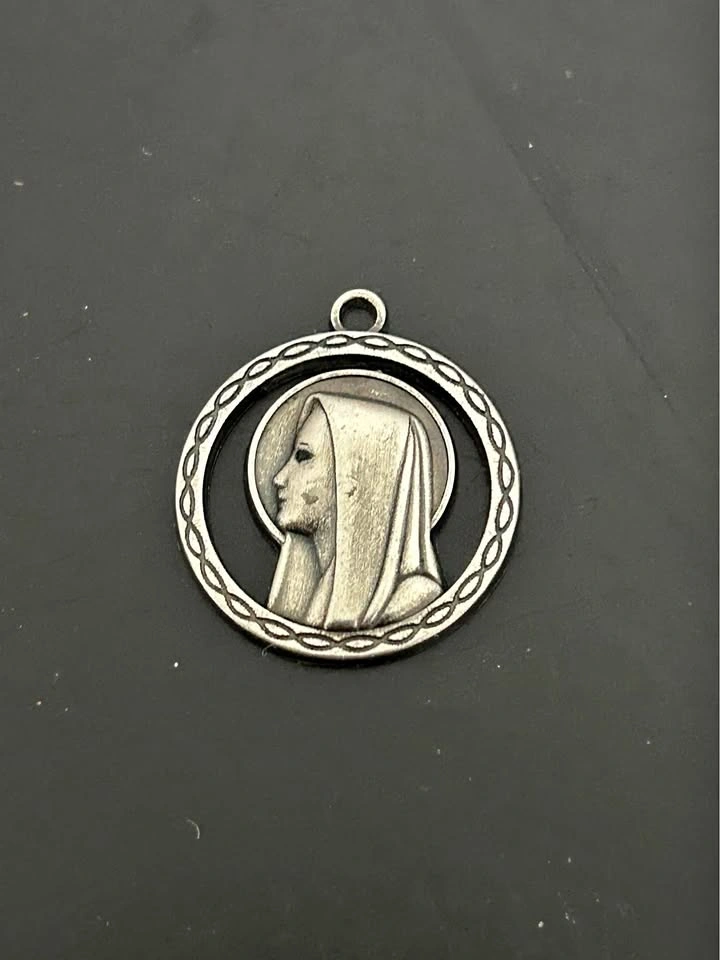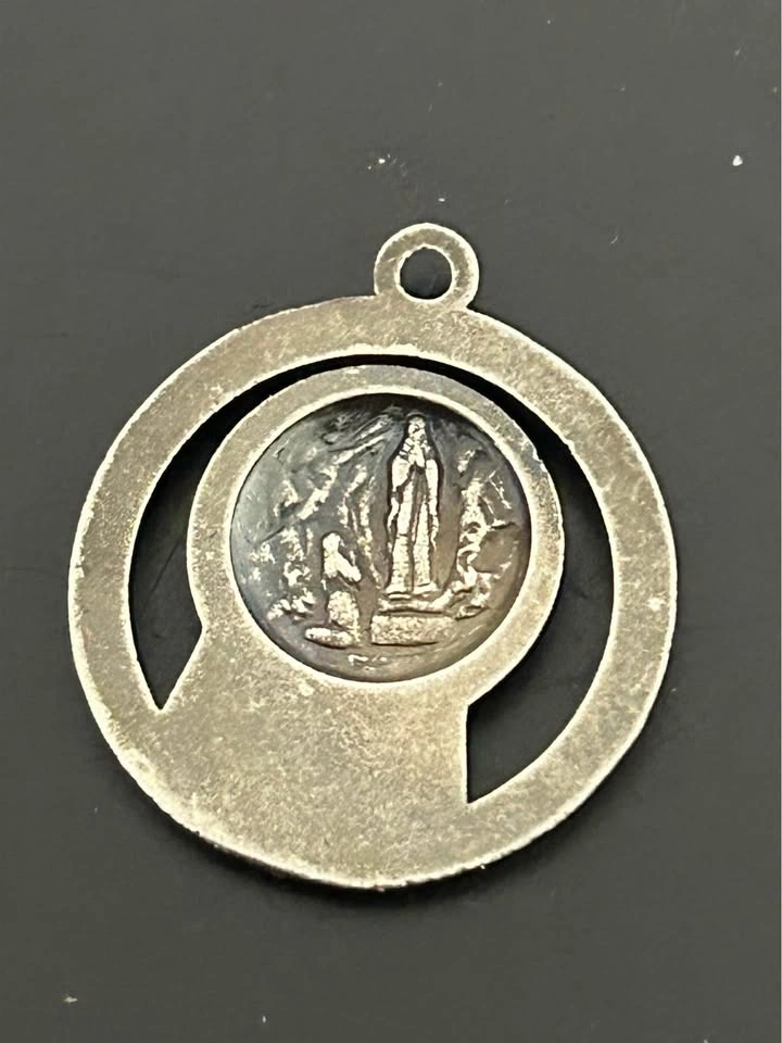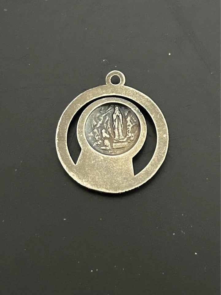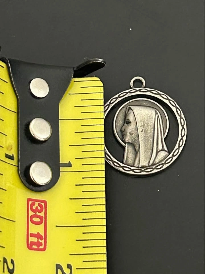 Beautiful vintage religious medal pendant featuring a double-sided design. One side depicts the Virgin Mary with Saint Bernadette at Lourdes, while the reverse shows a serene portrait of the Virgin Mary in profile. Crafted in a silver-tone metal with a cut-out circular frame. A meaningful devotional piece and a collectible religious item. Pick up: Seton area, Calgary. See also my other lots. Open to your questions and suggestions. If necessary, I provide additional photos. These are not new things, so please look carefully at the photos and videos. Sizes are submitted on request and also using a tape measure in the photo.