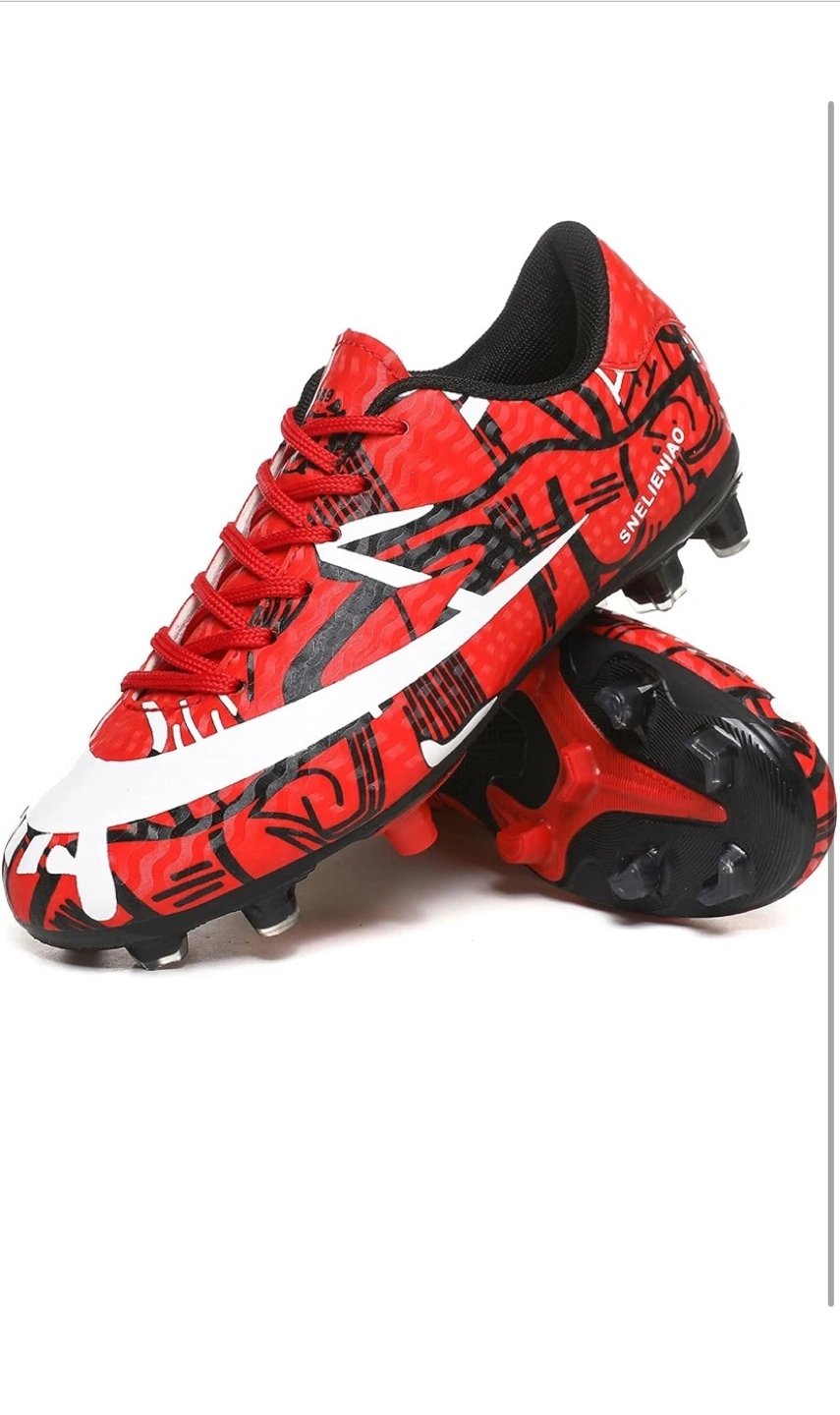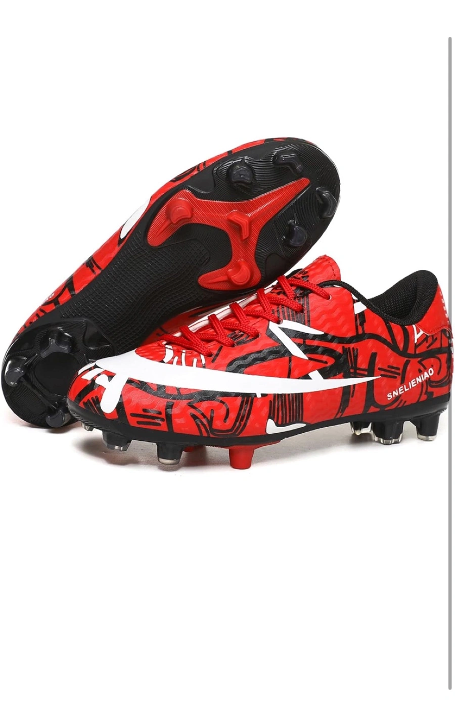 Check out these vibrant red SNELIENIAO soccer cleats! They feature a cool graphic design and are perfect for hitting the field. - Colour: Red TF - Size: 9 Women / 7 Men