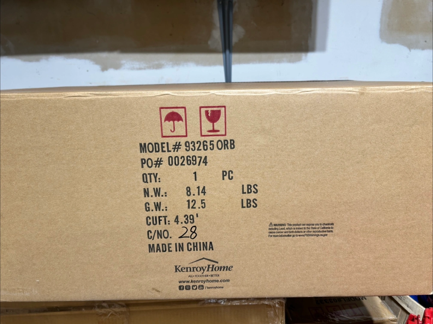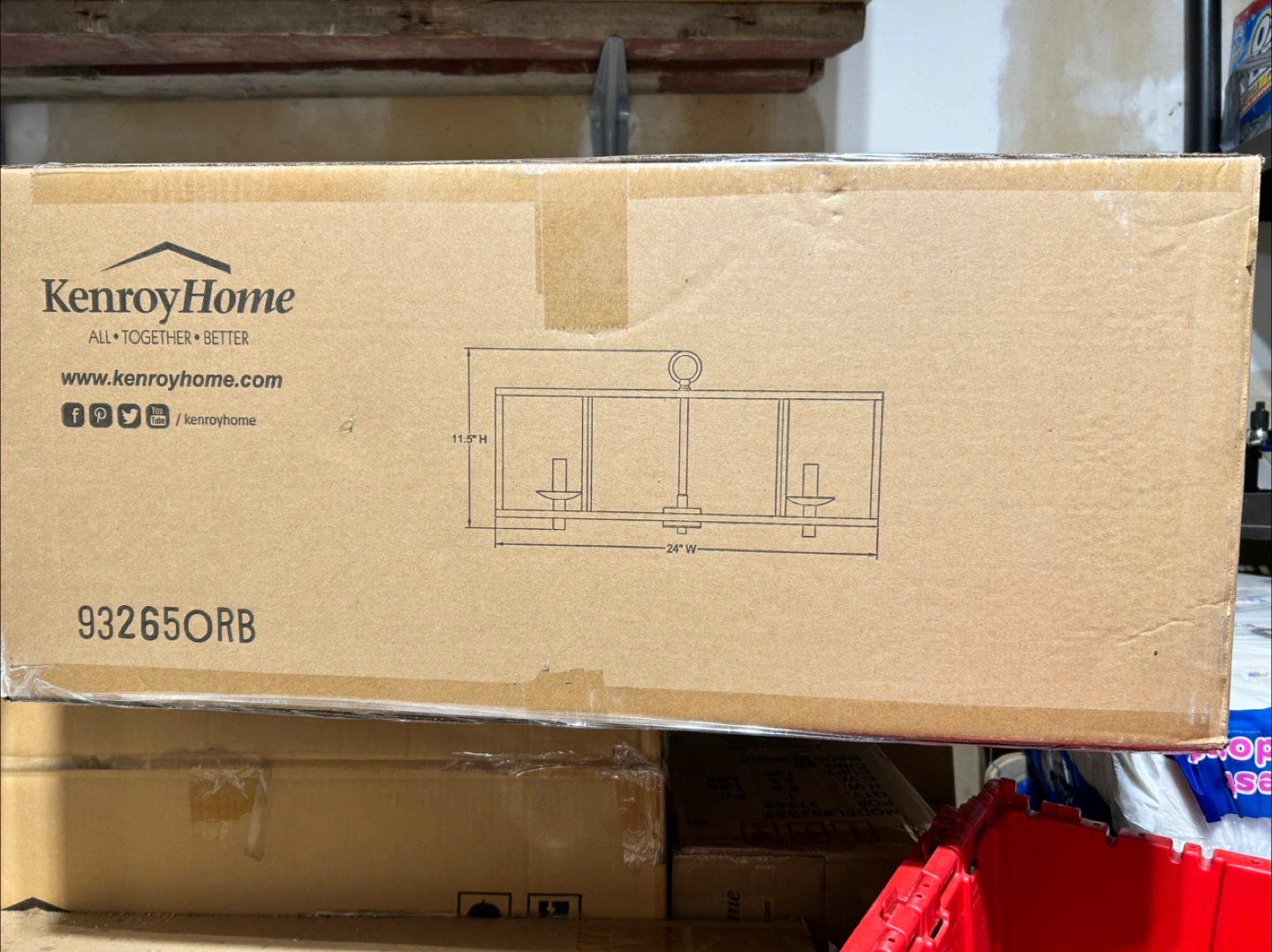 Selling a brand new Kenroy Home chandelier, model number 93265ORB. It's still in its original packaging and has never been used. The box indicates it's an oil-rubbed bronze finish. Dimensions are approximately 24" wide and 11.57" high. Perfect for adding a touch of elegance to your dining room or living space!