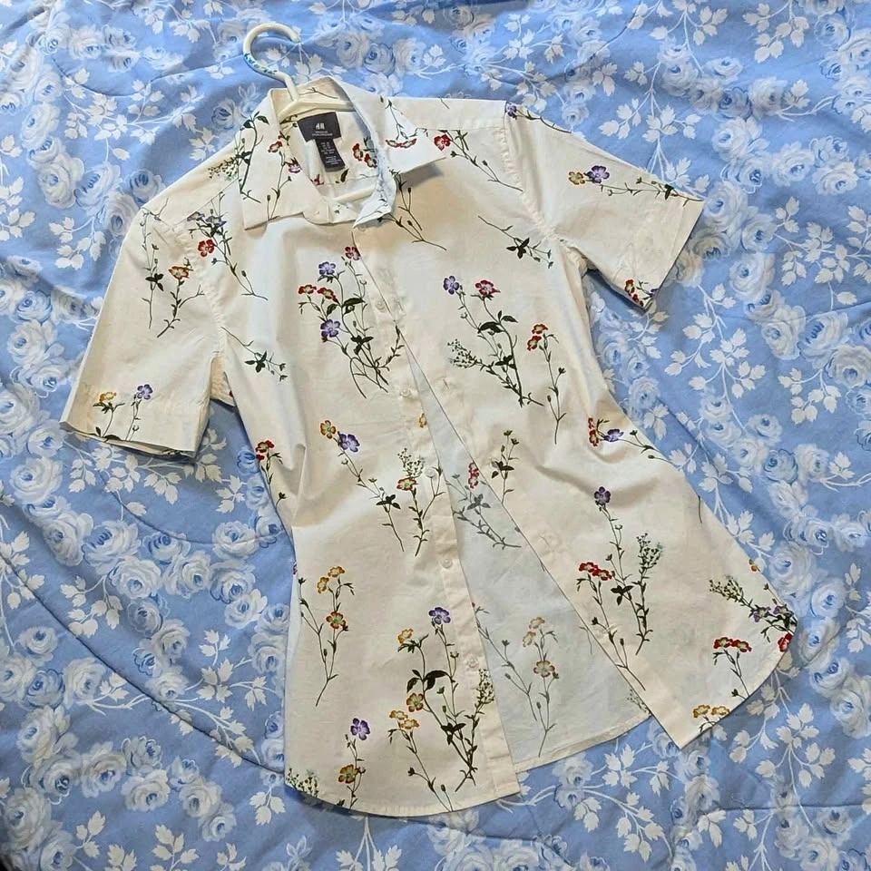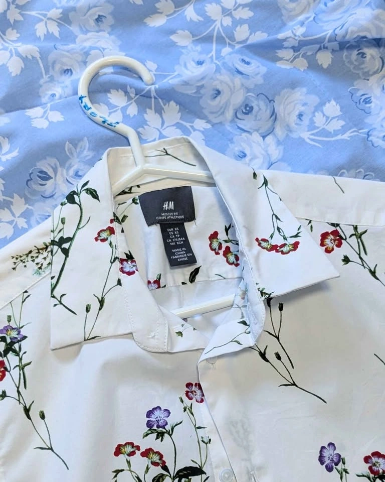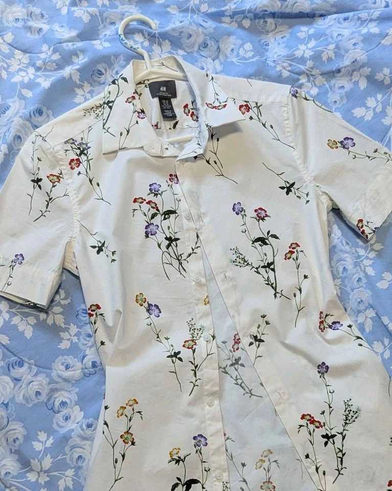 Fitted floral button-up from H&M! Size XS, tag says muscle fit but it fit me pretty well! Just doesn't fit my shoulders anymore. Looks off-white on camera for some reason but it's white in person. Pick-up in east Scarborough!!