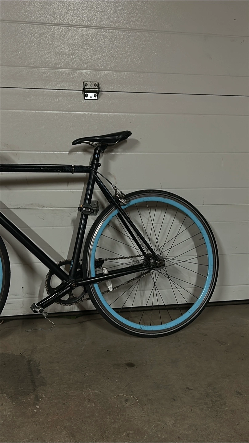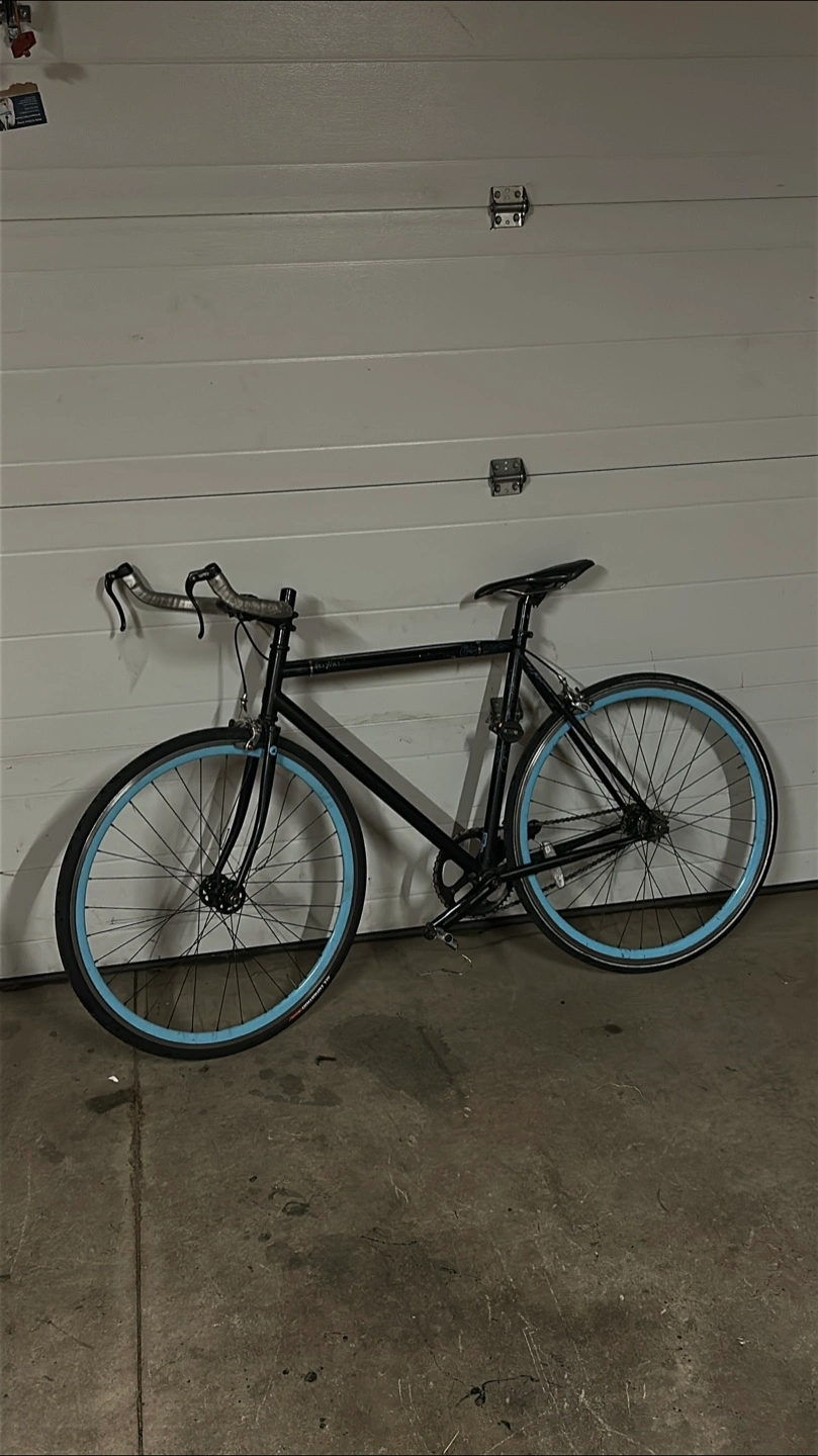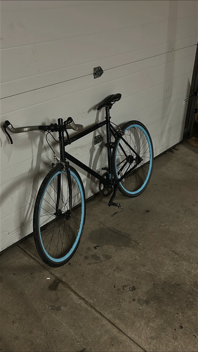 Selling a fixed gear bike in great condition! It features a sleek black frame and eye-catching blue rims. The pedals are from Wellgo. Ready for a new owner to enjoy!