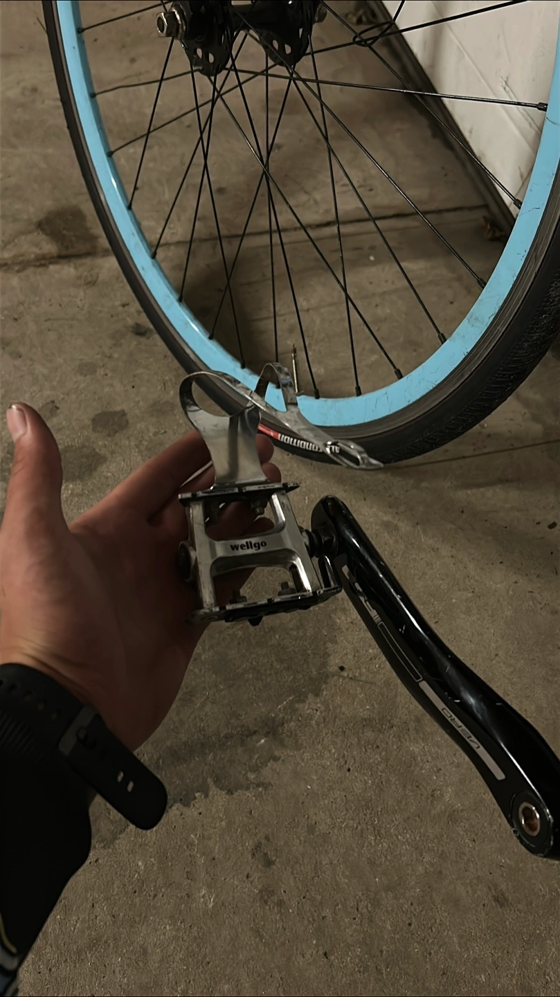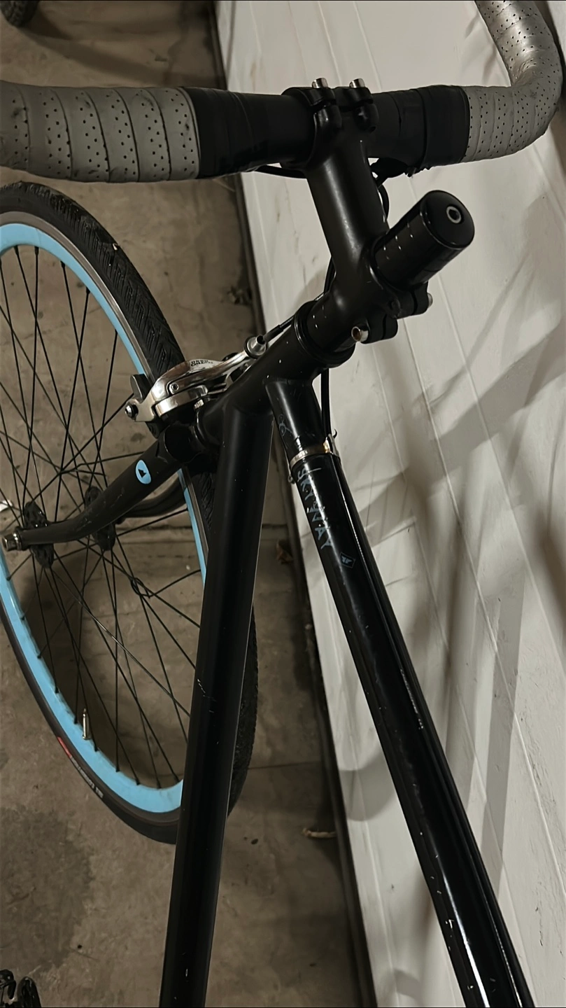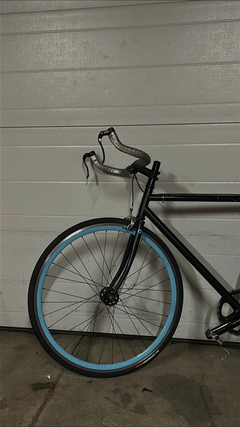 Selling a fixed gear bike in great condition! It features a sleek black frame and eye-catching blue rims. The pedals are from Wellgo. Ready for a new owner to enjoy!