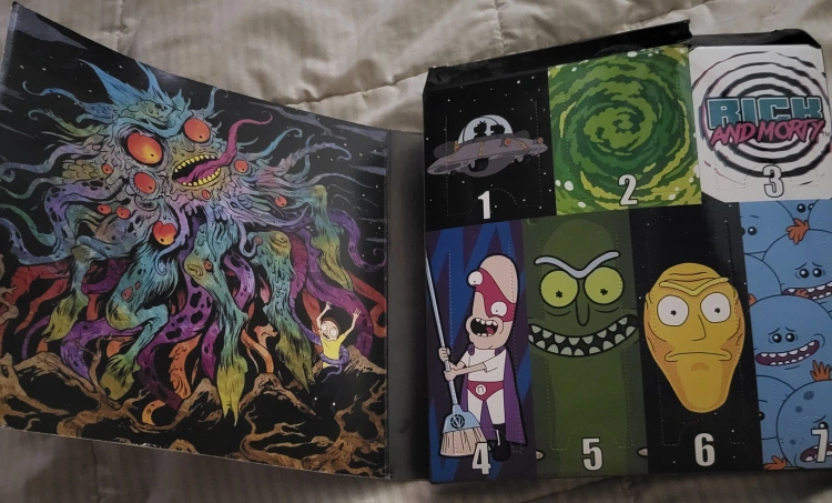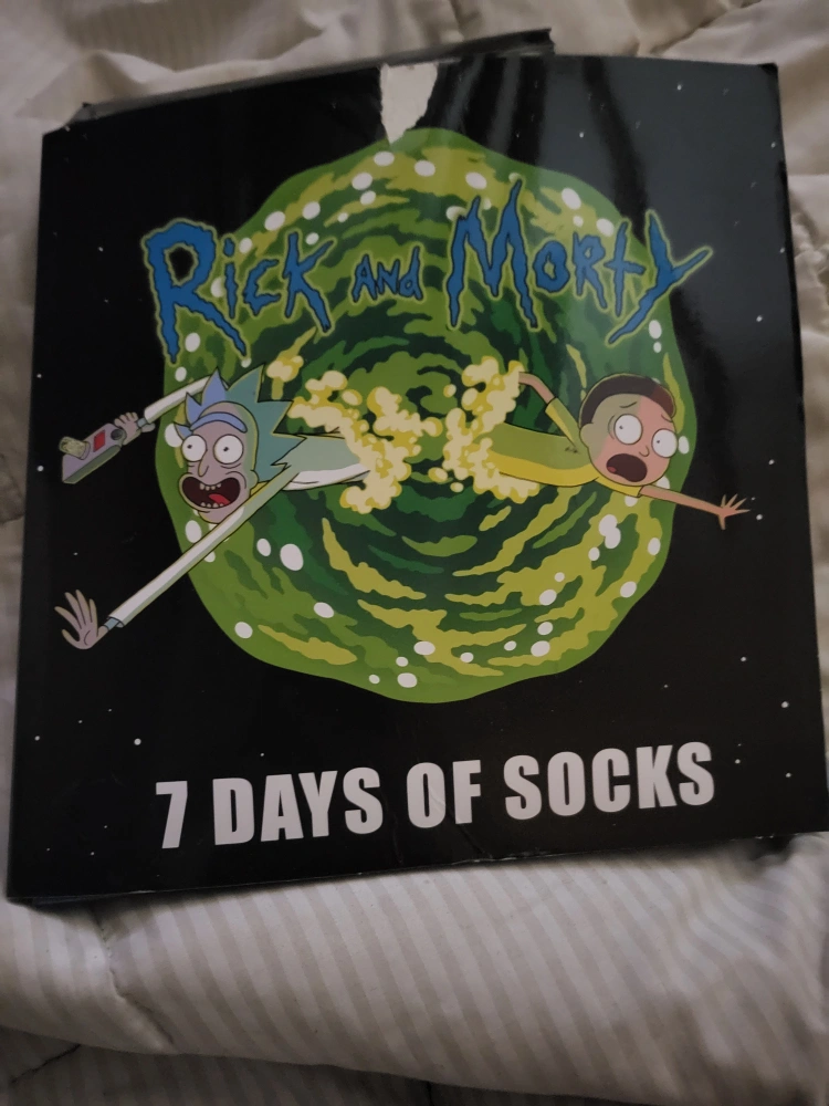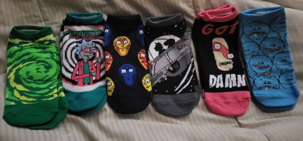 Selling a brand new set of Rick and Morty socks! This is the '7 Days of Socks' collection, featuring a different designs for each day of the week - **Although! 1 pair seems to have fallen out during the move! SO the set is only 6 pairs. Still valid for the Rick & Morty Fans!