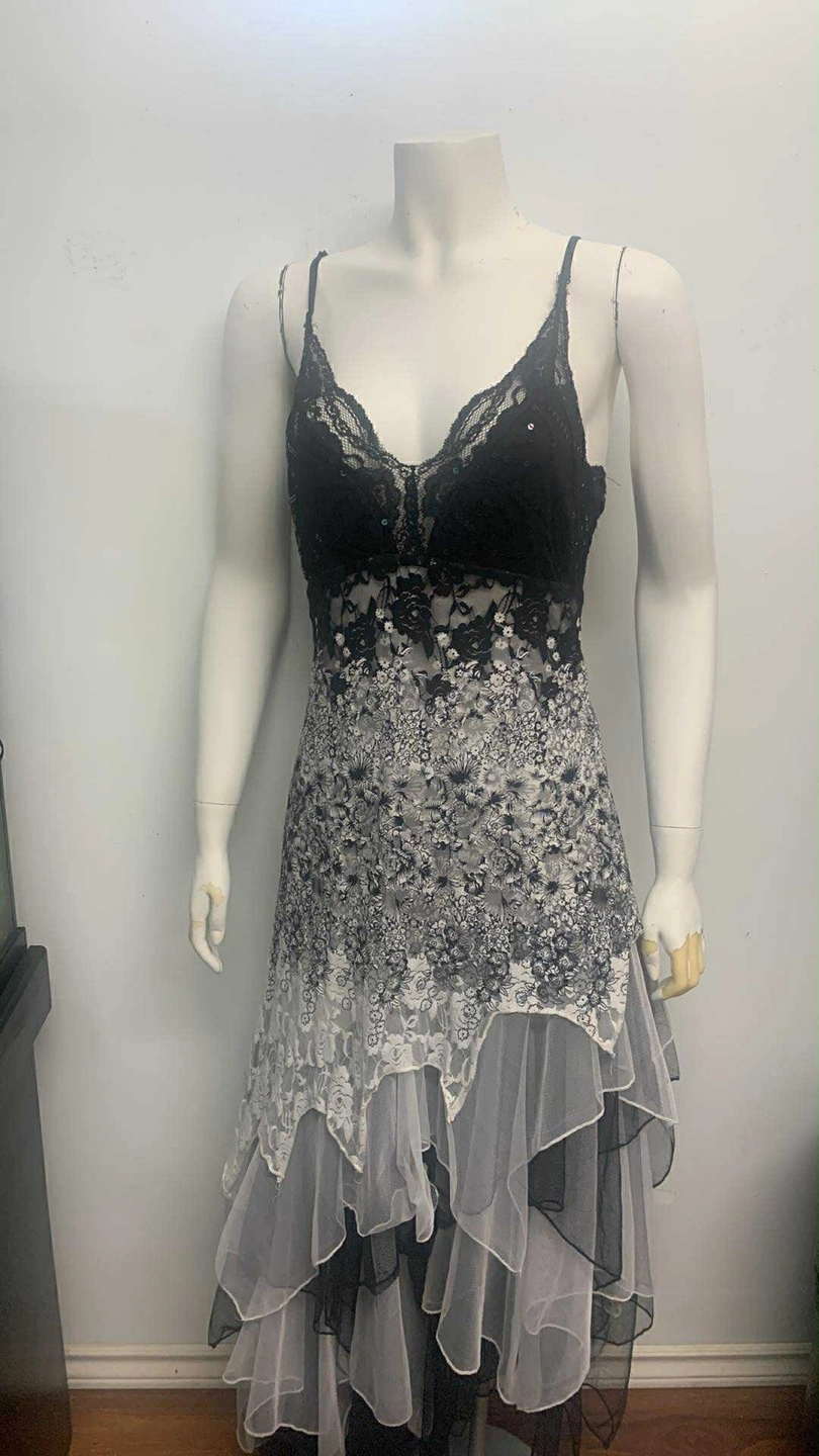 This dress features a black lace bodice with a floral print skirt that fades from grey to white. The bottom has layered ruffles of white and black tulle. It's perfect for a special occasion!