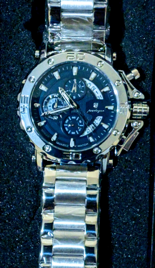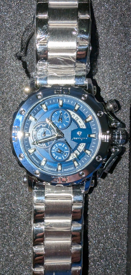 beautiful men's stainless steel watch with multi functional chronograph. this watch is very high quality and looks amazing for professional and casual attire. the watch as a big face, buttons and wide strap making this a great stand out watch. New in gift box never worn.