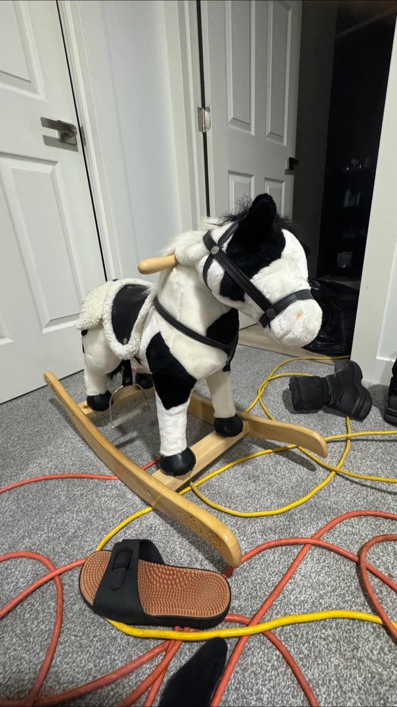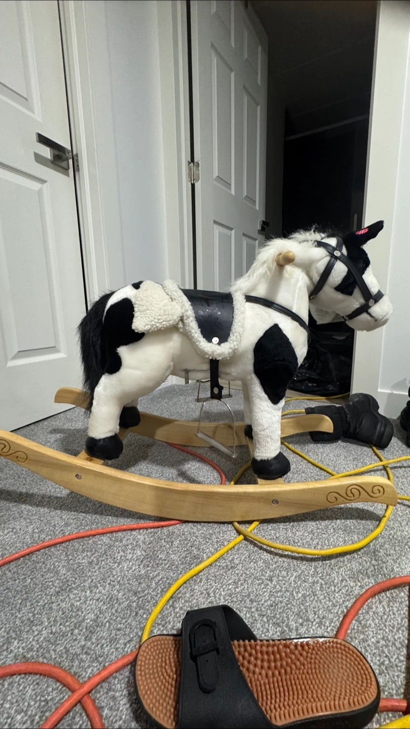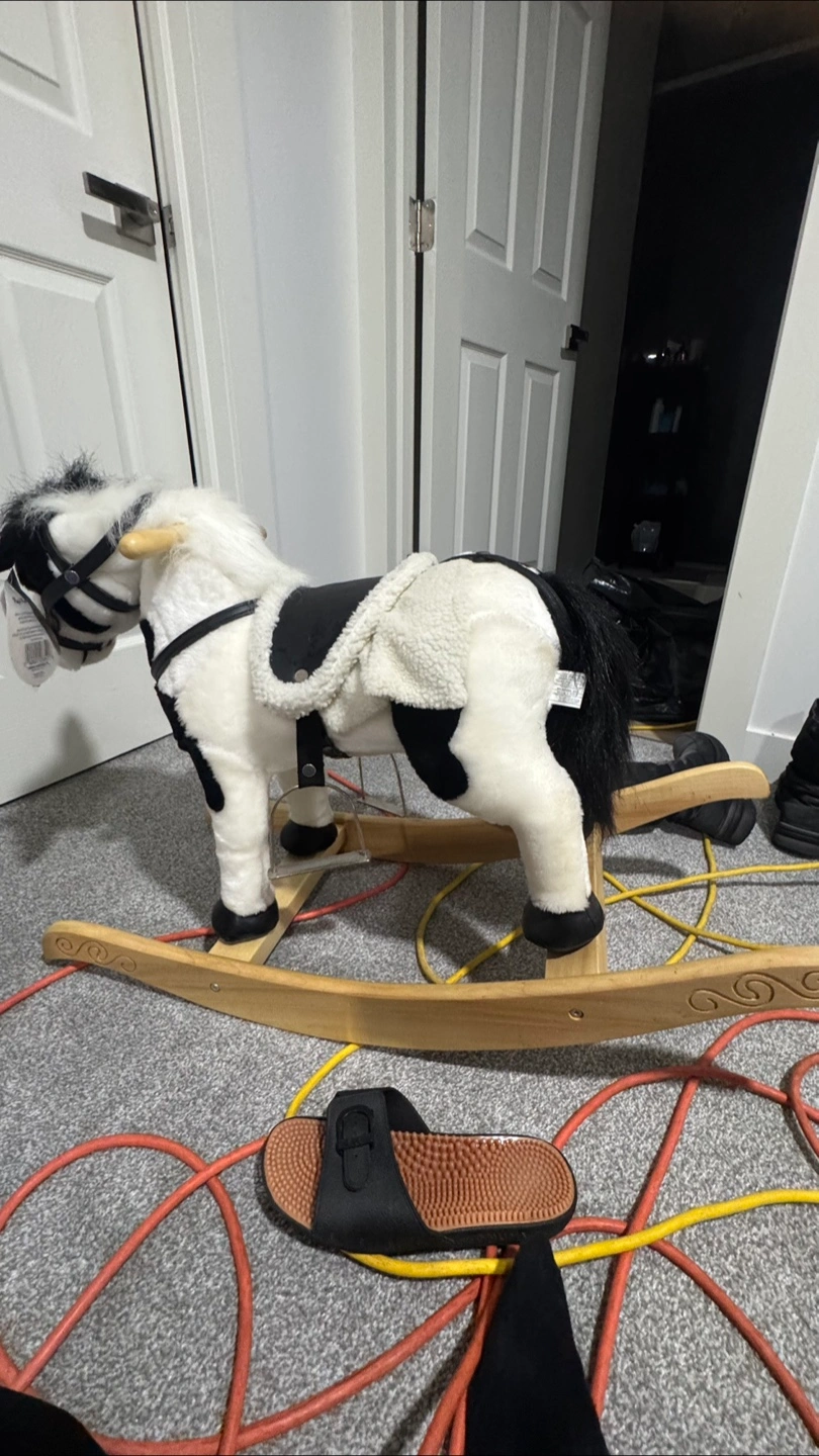 This is an animated rocking horse with realistic horse sounds. It's in great condition and ready for a new home. The rocking horse is black and white and has a saddle.