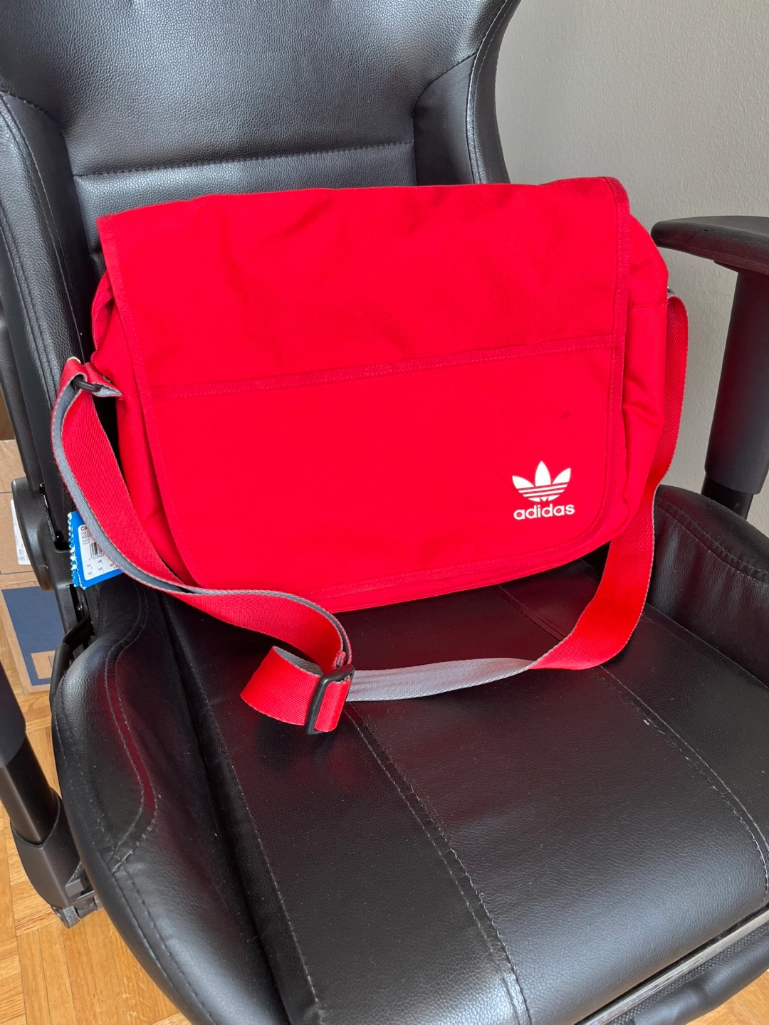 A really great and spacious adidas bag. Still has the tag. Used less than 5 times. Has a light stain at the bottom that’s not too noticeable. Adjustable strap, 5 pockets in total