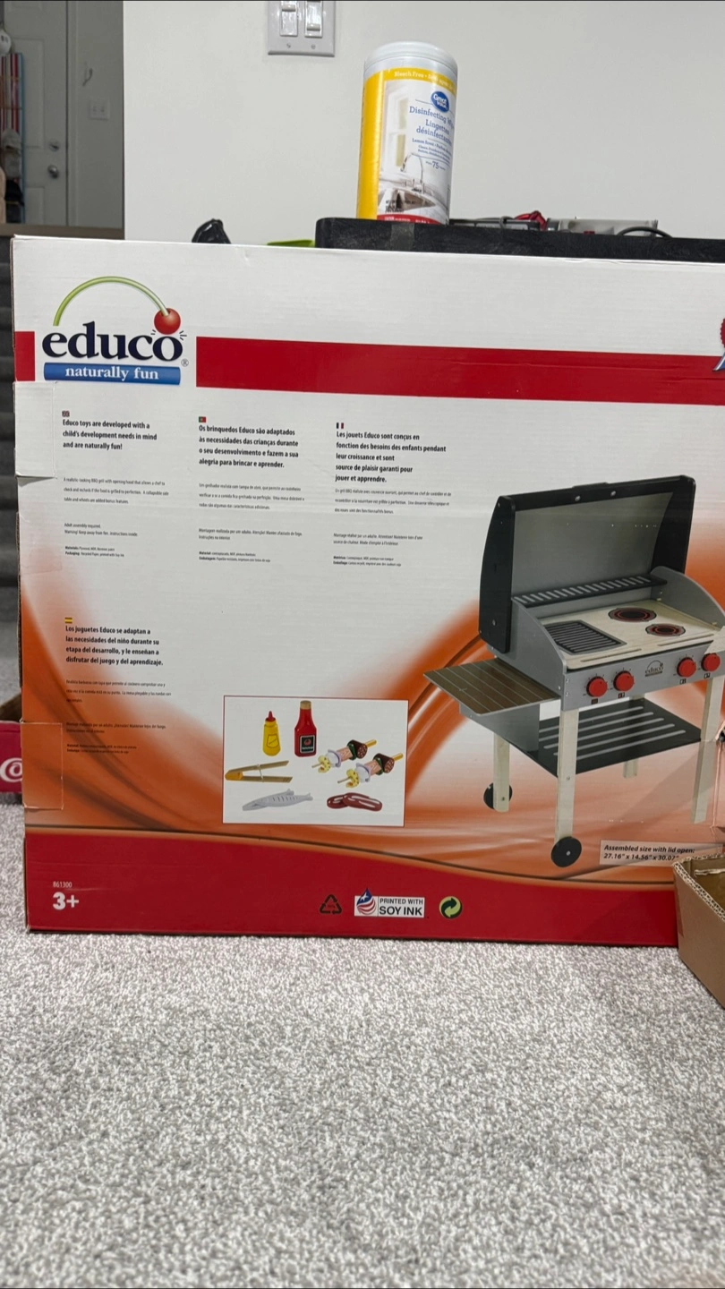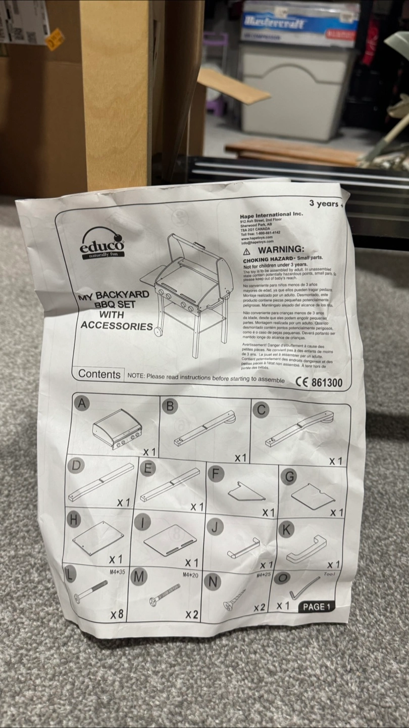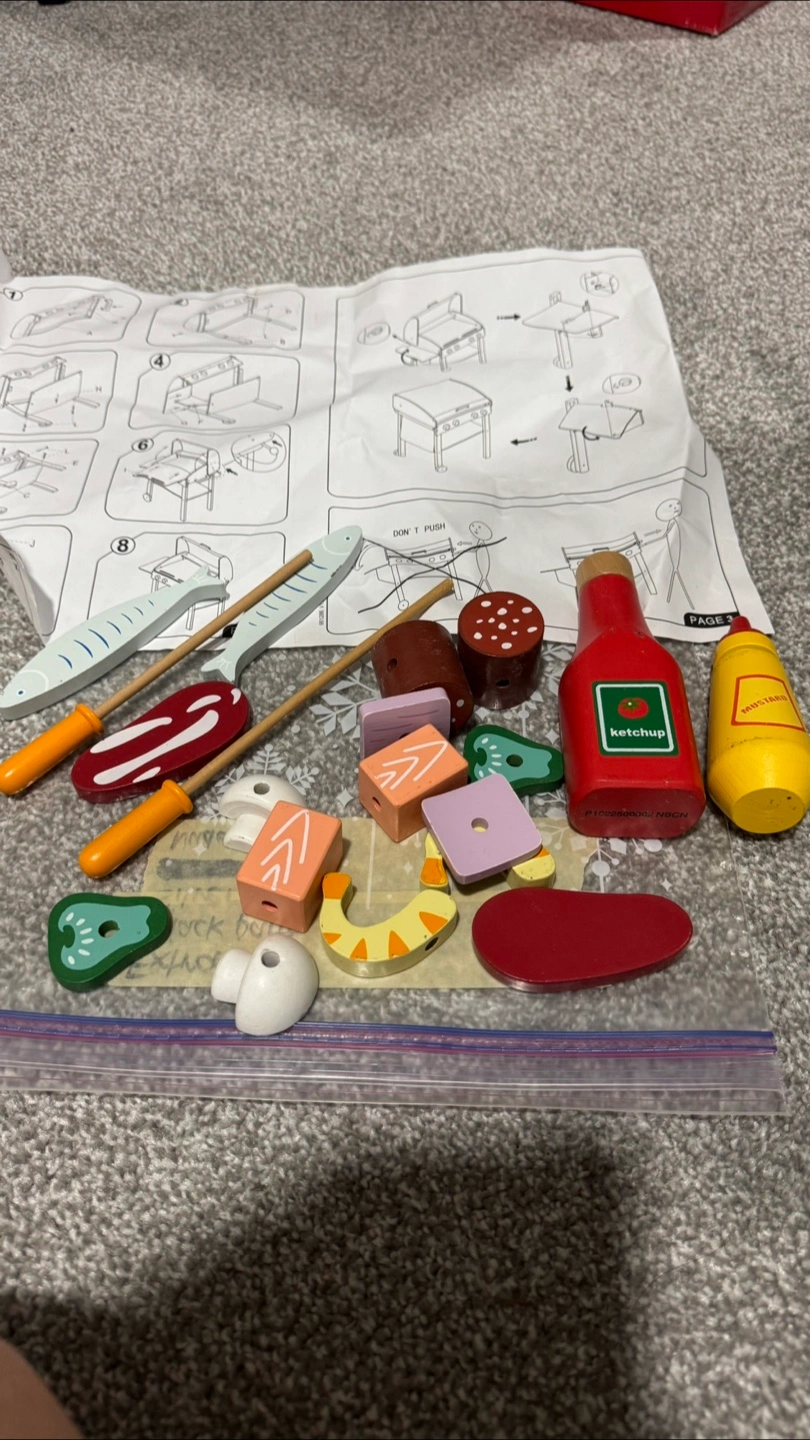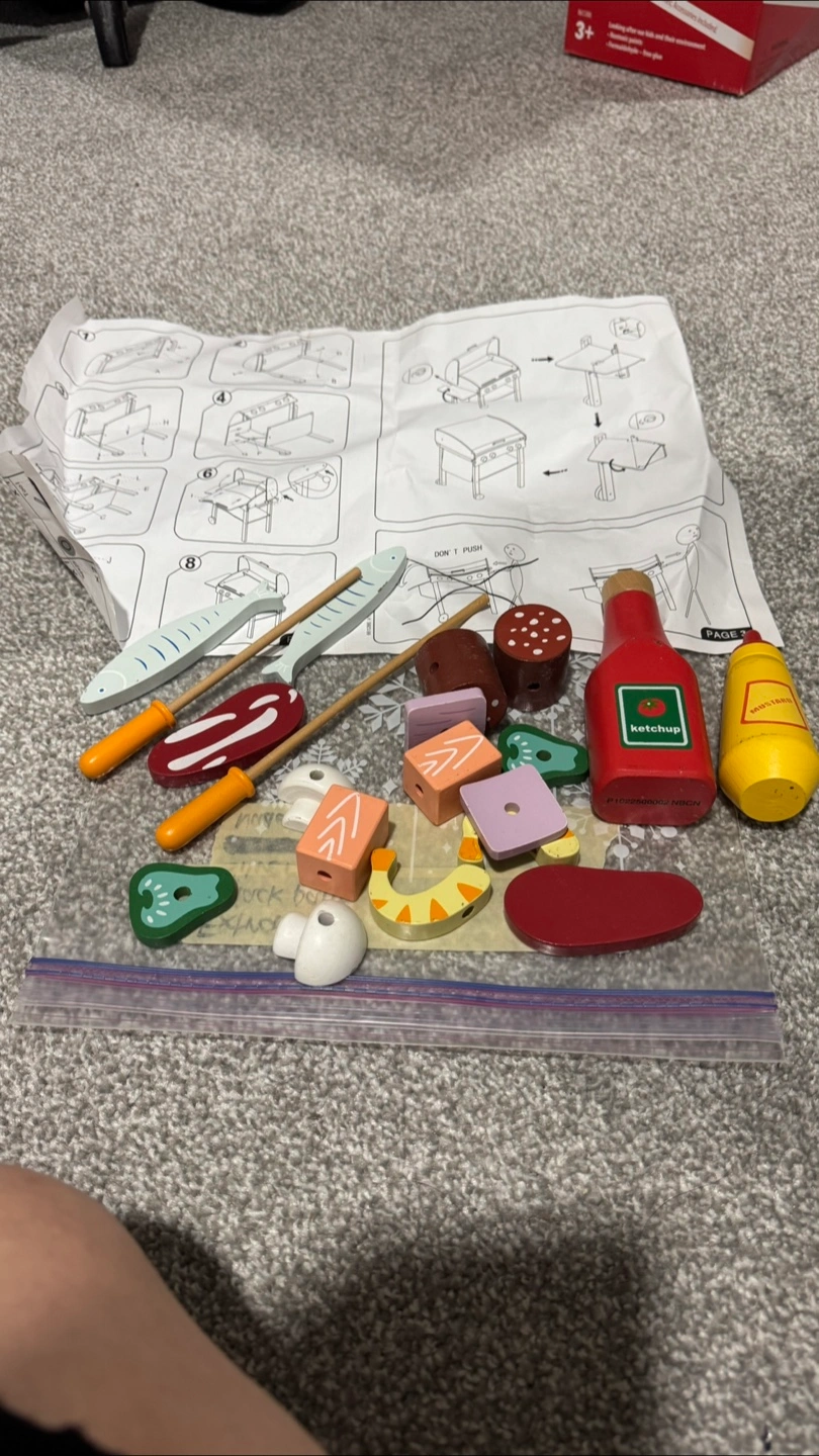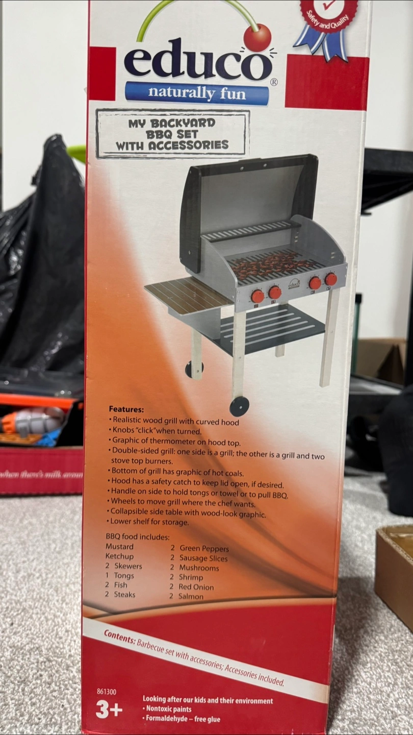 Selling a gently used Educo My Backyard BBQ Set with Accessories! This set is perfect for kids aged 3+. It includes: - Realistic wood grill with curved hood - Double-sided grill: one side is a grill, the other is a grill and two stove top burners - BBQ food including mustard, ketchup, skewers, tongs, fish, steaks, green peppers, sausage slices, mushrooms, shrimp and red onion Comes with all accessories as shown in the photos. Looking after our kids and their environment with nontoxic paints and formaldehyde-free glue