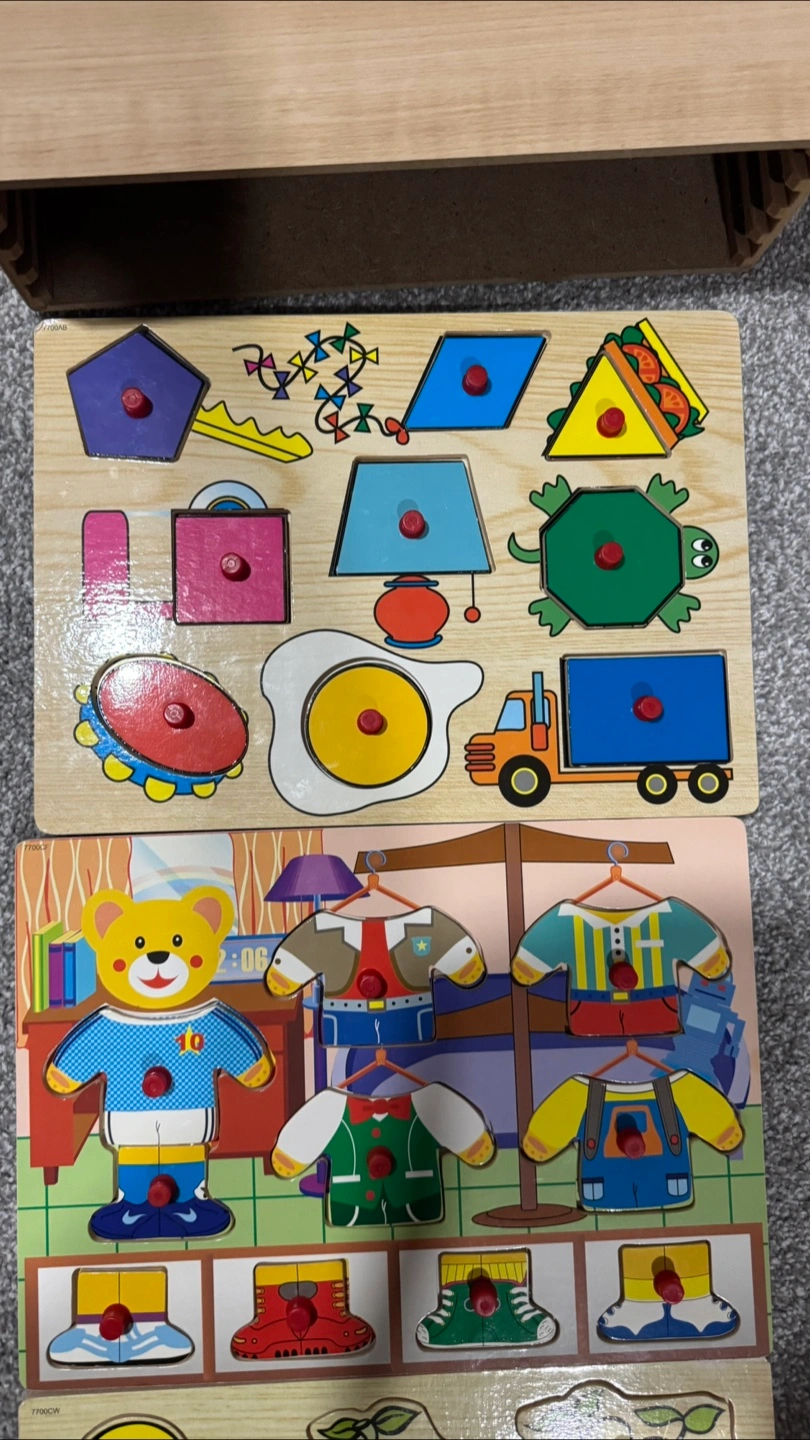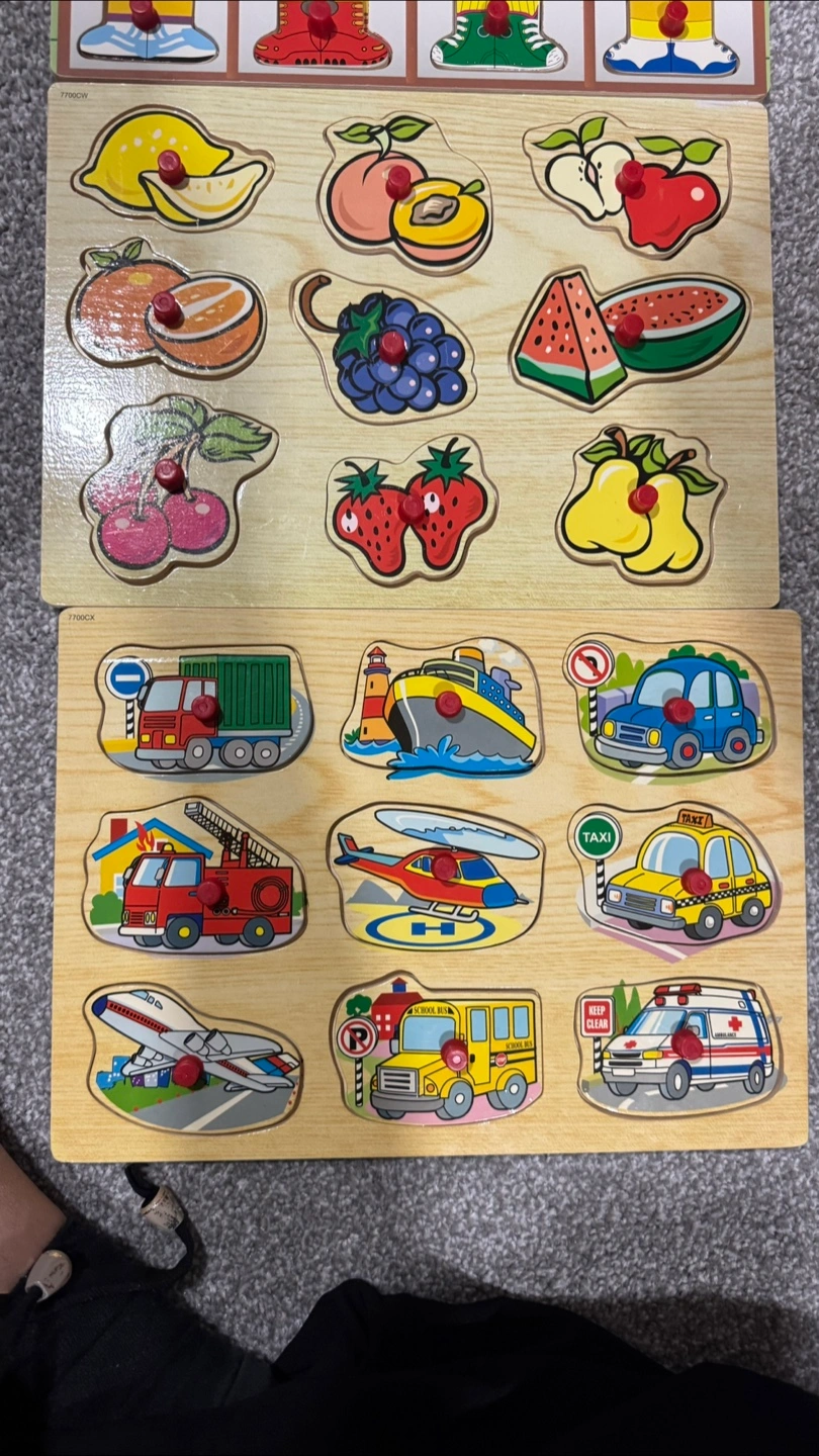 Selling a set of four wooden peg puzzles. They feature colourful pictures of shapes, clothes, fruits, and vehicles. Great for toddlers learning about different objects and developing their fine motor skills!