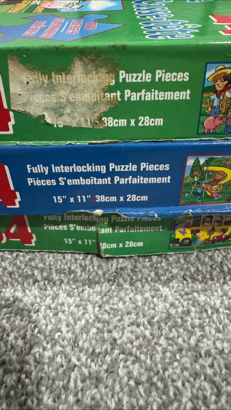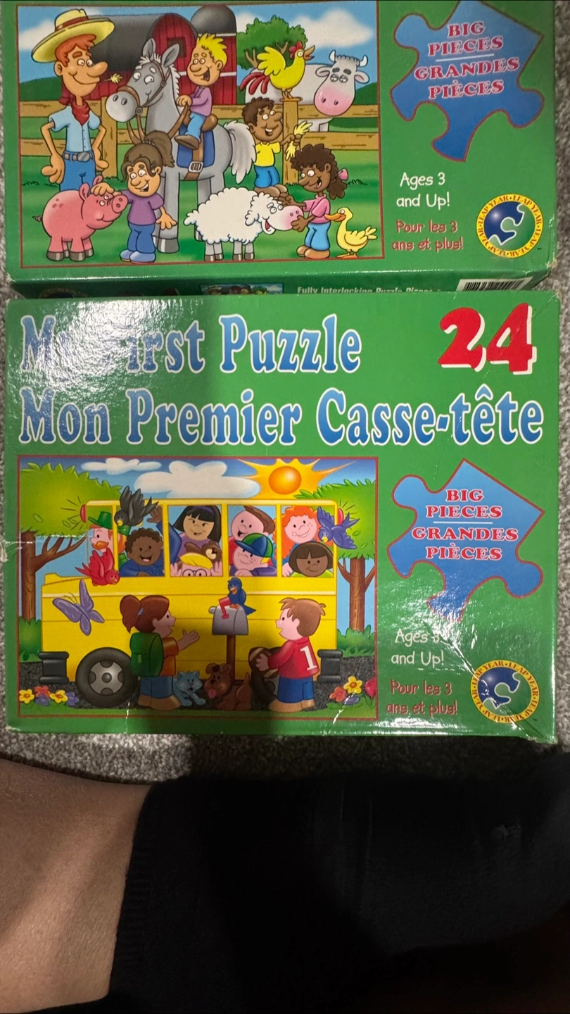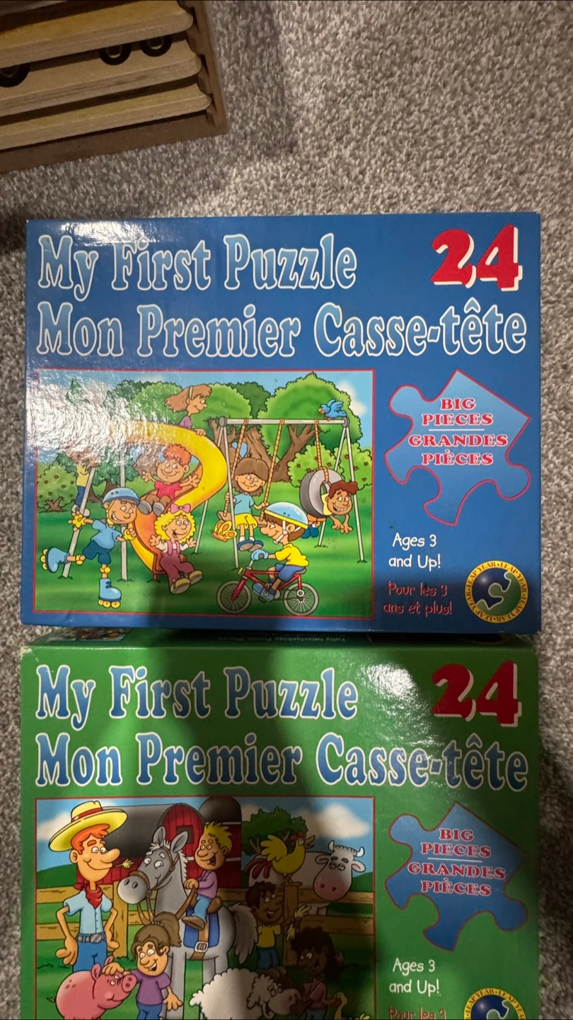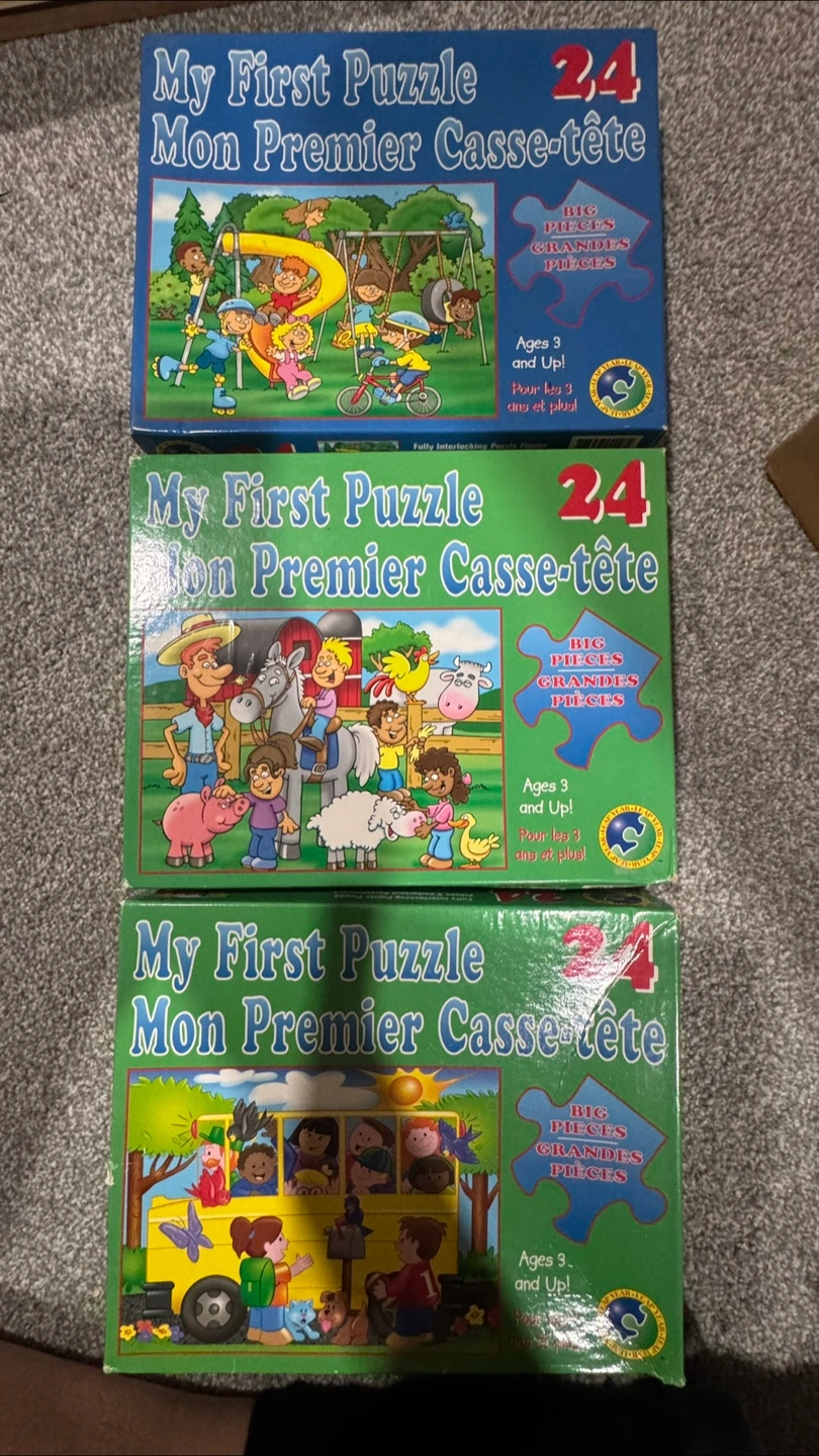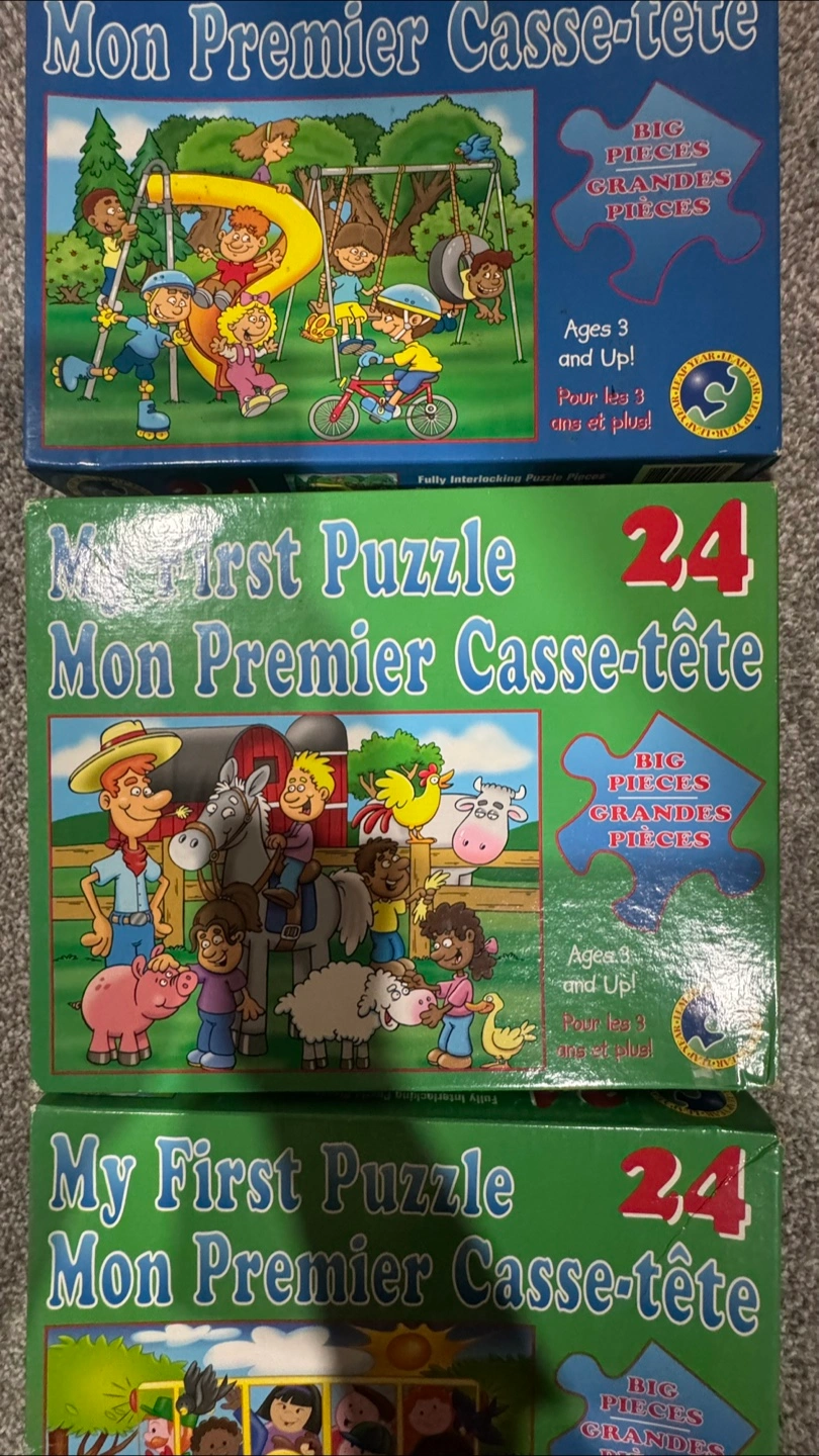 Selling three 'My First Puzzle' sets, each with 24 big pieces. They're fully interlocking and measure 15" x 11" / 38cm x 28cm. Recommended for ages 3 and up!