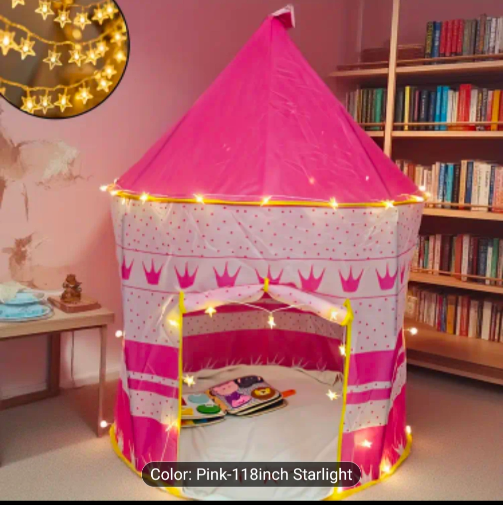 A cute pink princess castle play tent, perfect for kids! It's 118 inches in size and features starlight details. New unopened.