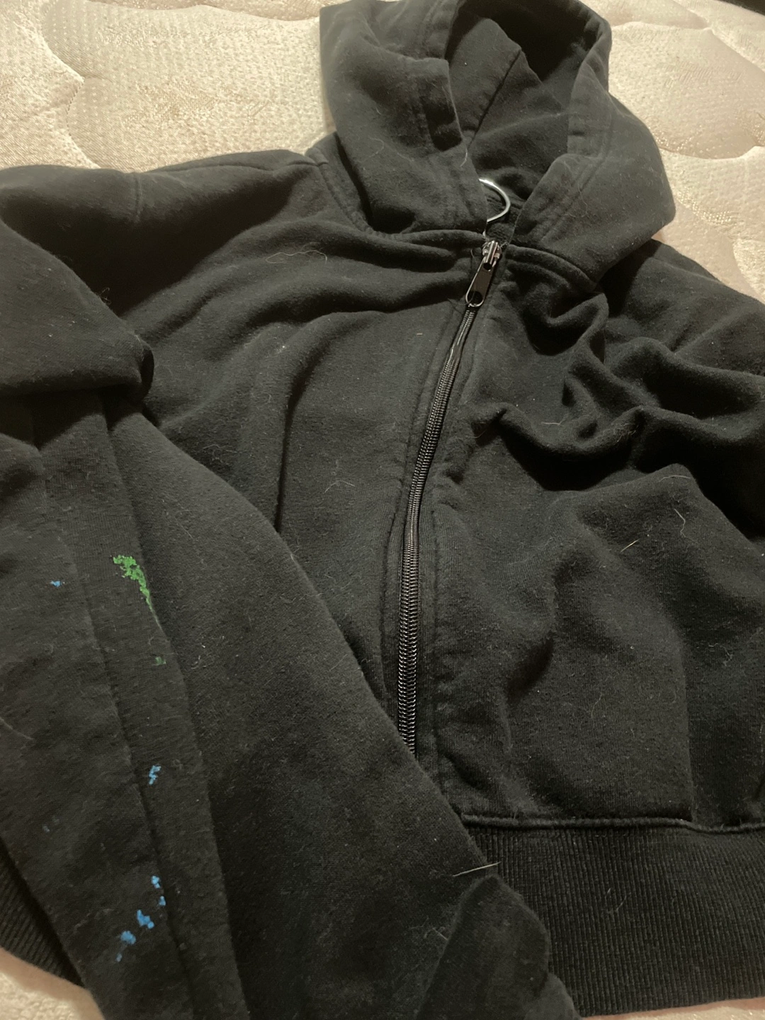 Selling an Ardene black hoodie in size S/P. It's a comfy and casual piece, perfect for layering or just lounging around. Please note there are some paint stains on the sleeve.