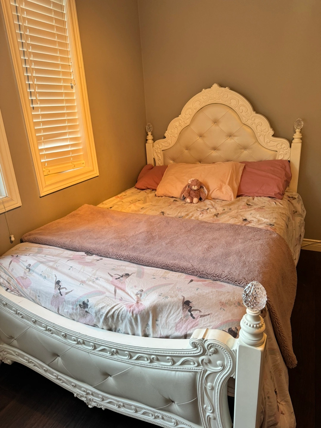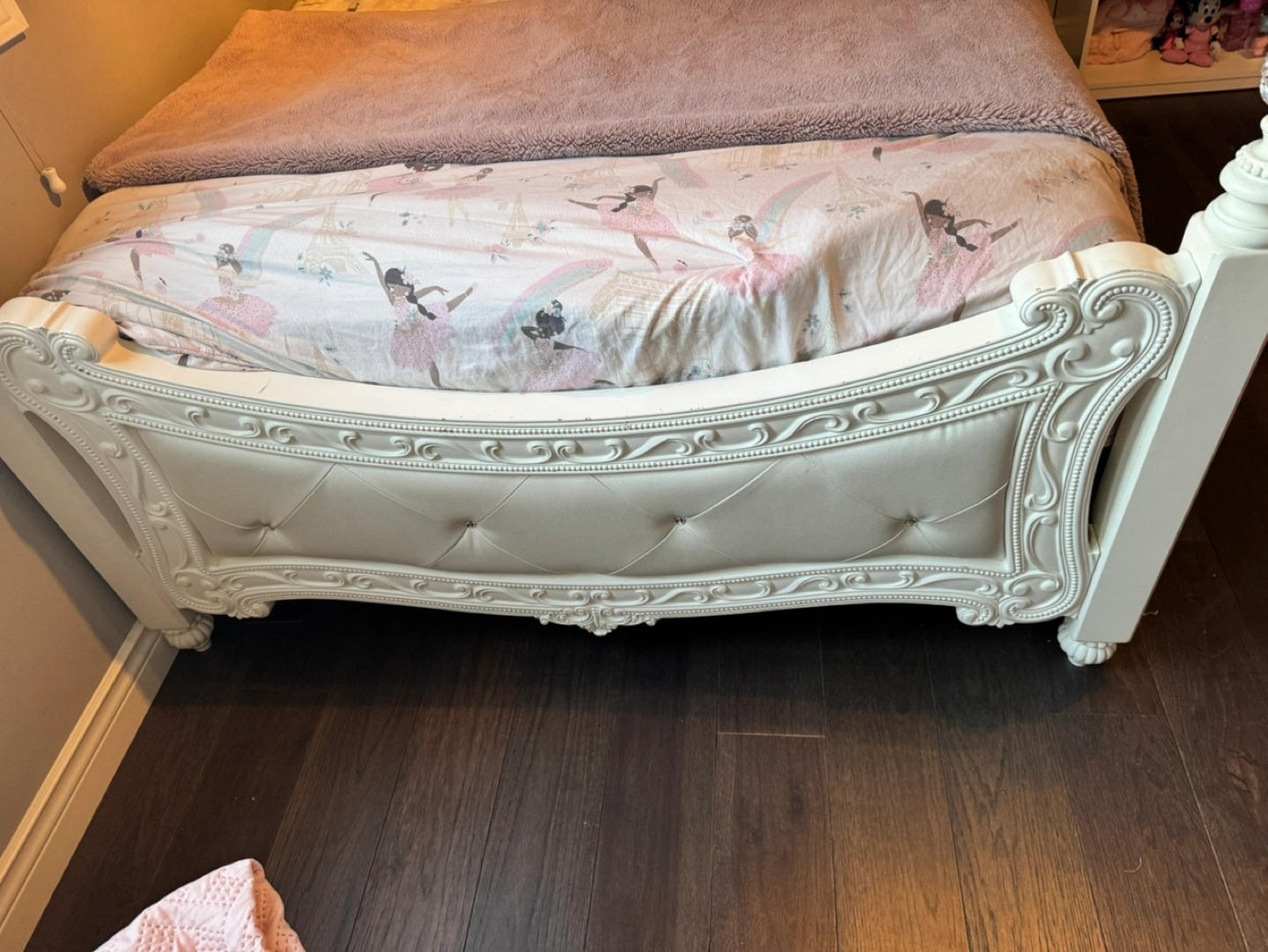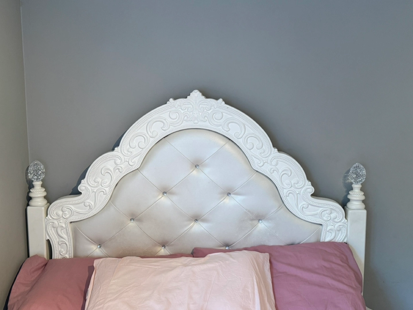 Double bed frame (83”x57”) will be disassembled Upholstered headboard and footboard — Diamond tufted white vegan leather Iron bed frame Matching desk is also available! *mattress and box spring not included