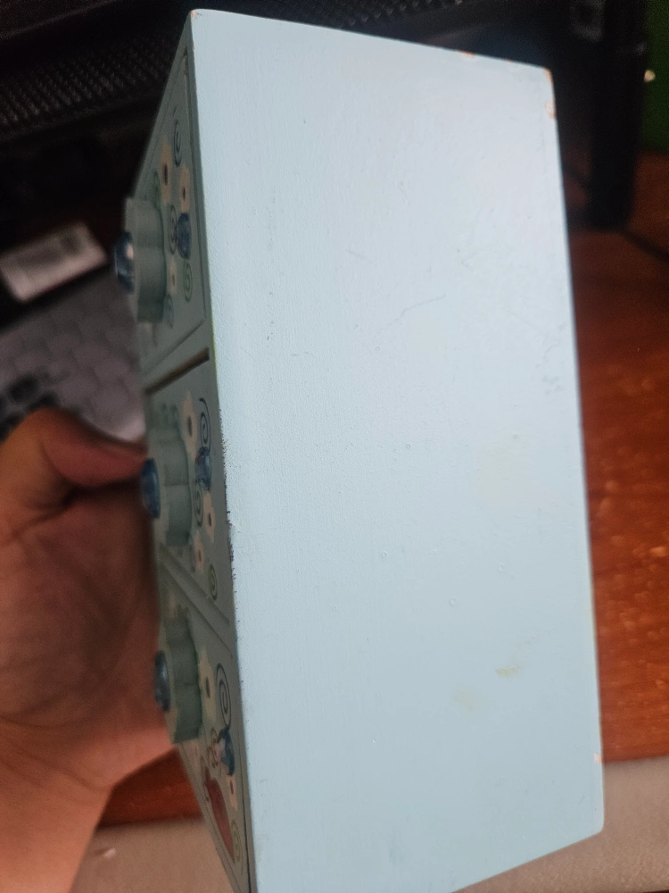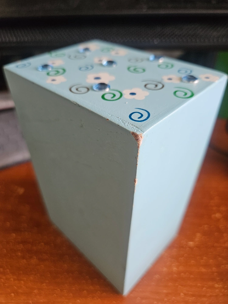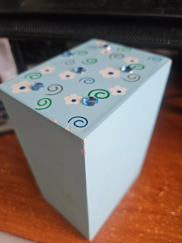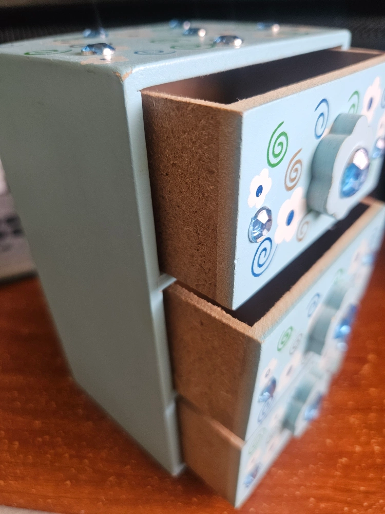 -Here's a cute little set of mini drawers! It's made of wood and painted a light blue colour with floral designs and gem-like accents. There's a bit of wear on the corners, as you can see in the photos, but it's still a charming piece for storing small items -still good