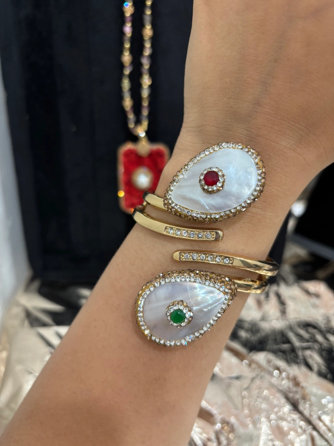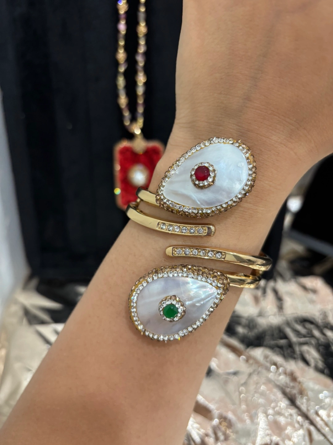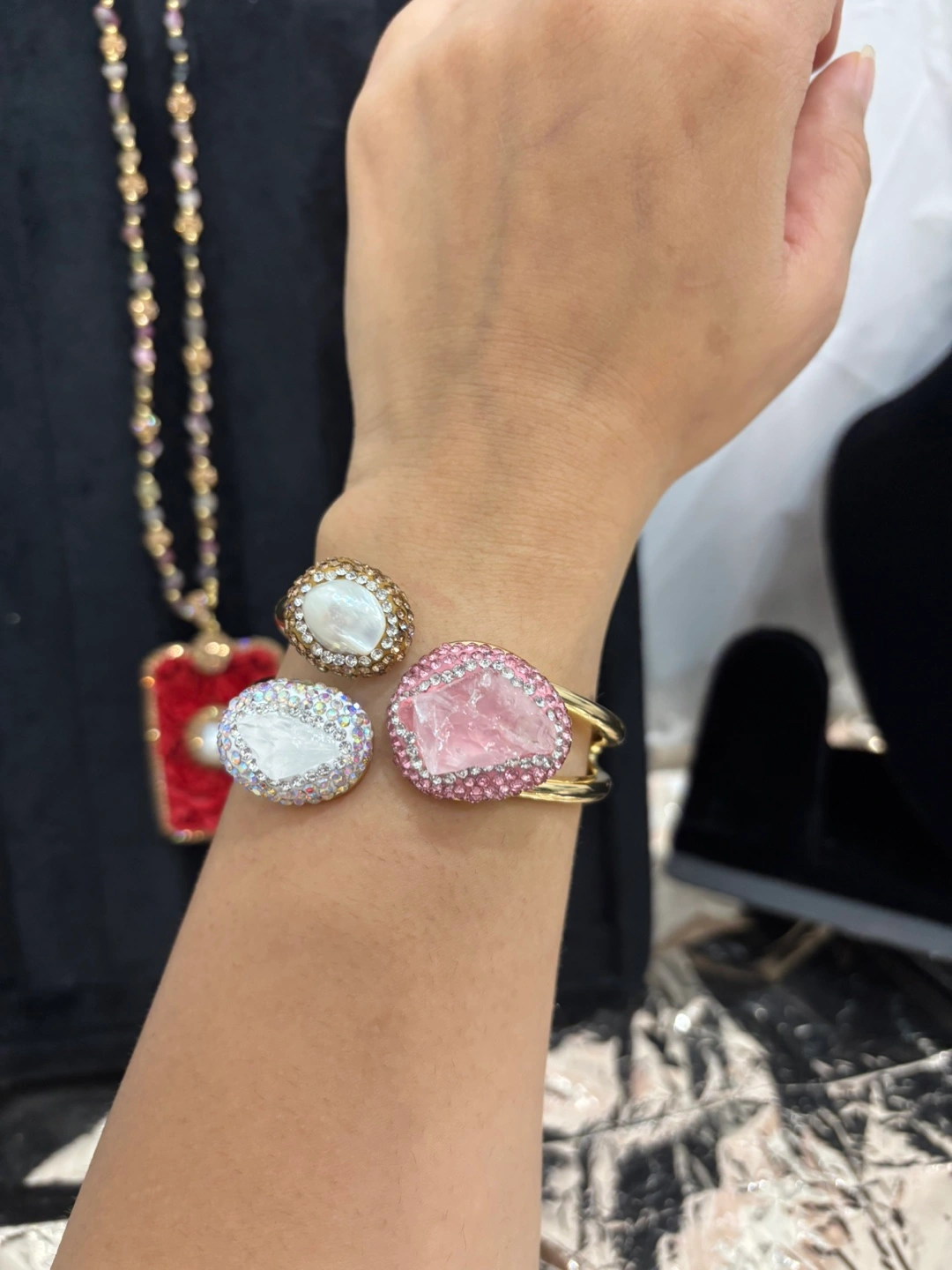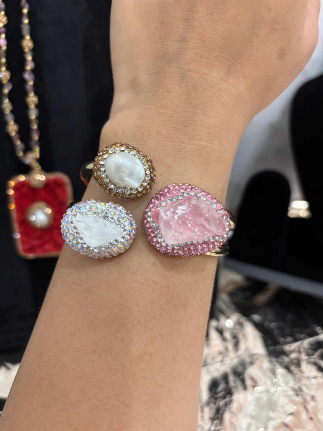 I'm selling a set of three unique cuff bracelets! Each features a different gemstone design, including pearl, white stone, and pink stone options. They add a touch of elegance to any outfit!