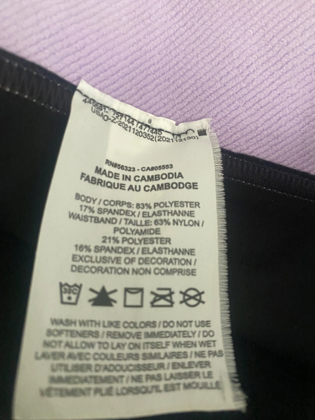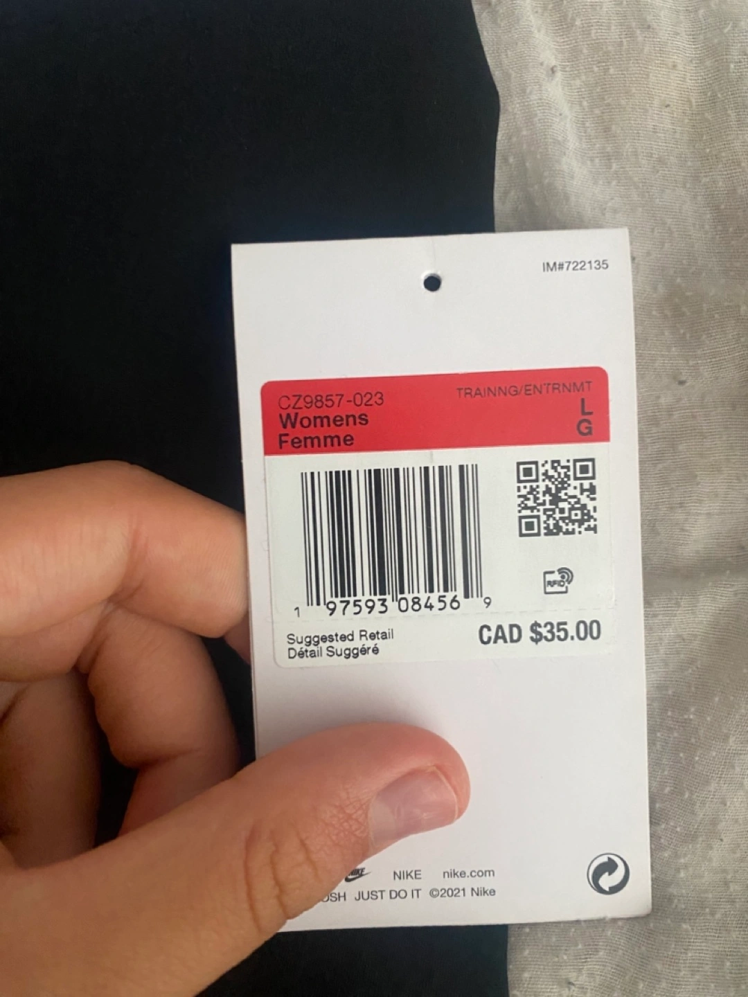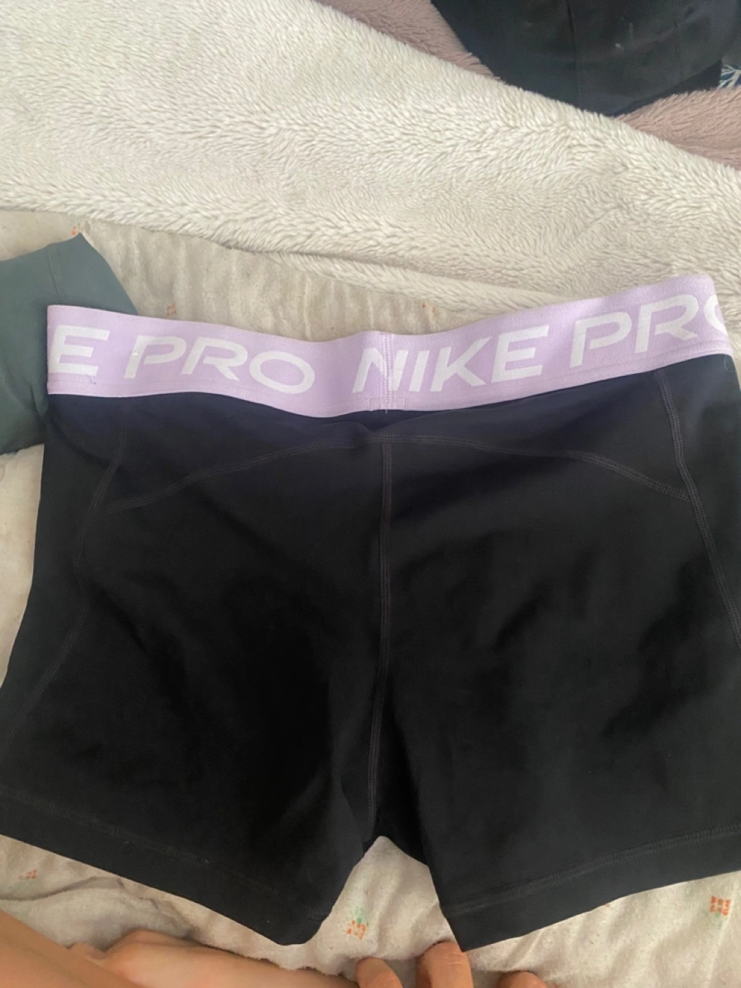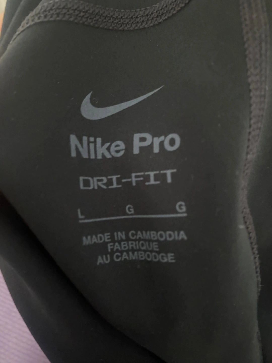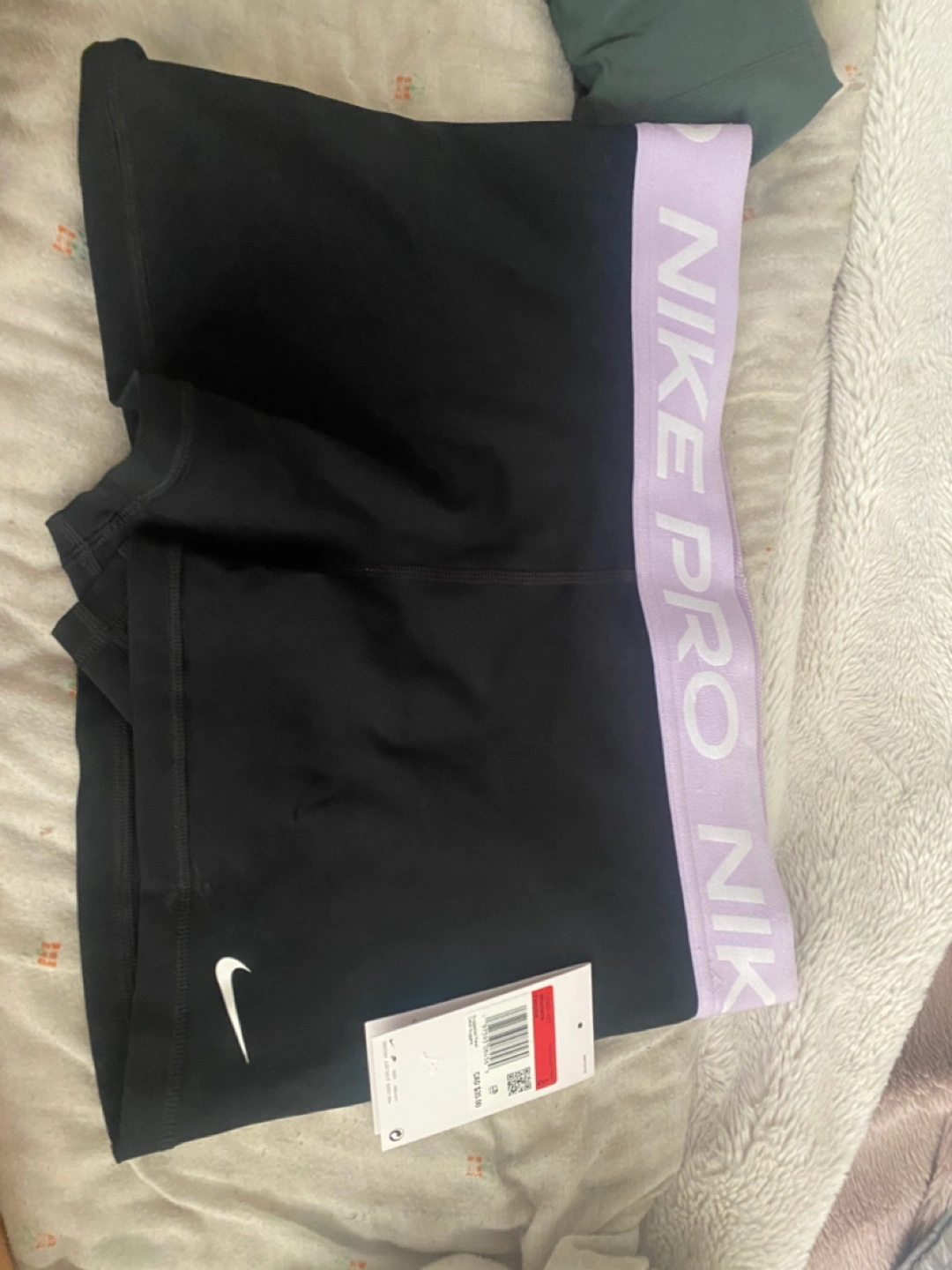 Selling a pair of Nike Pro women's training shorts in size large. They're black with a lilac-coloured waistband. The tag shows that the suggested retail price was CAD $35.00. The body is made of 83% polyester and 17% spandex, while the waistband is 63% nylon and 21% polyester and 16% spandex