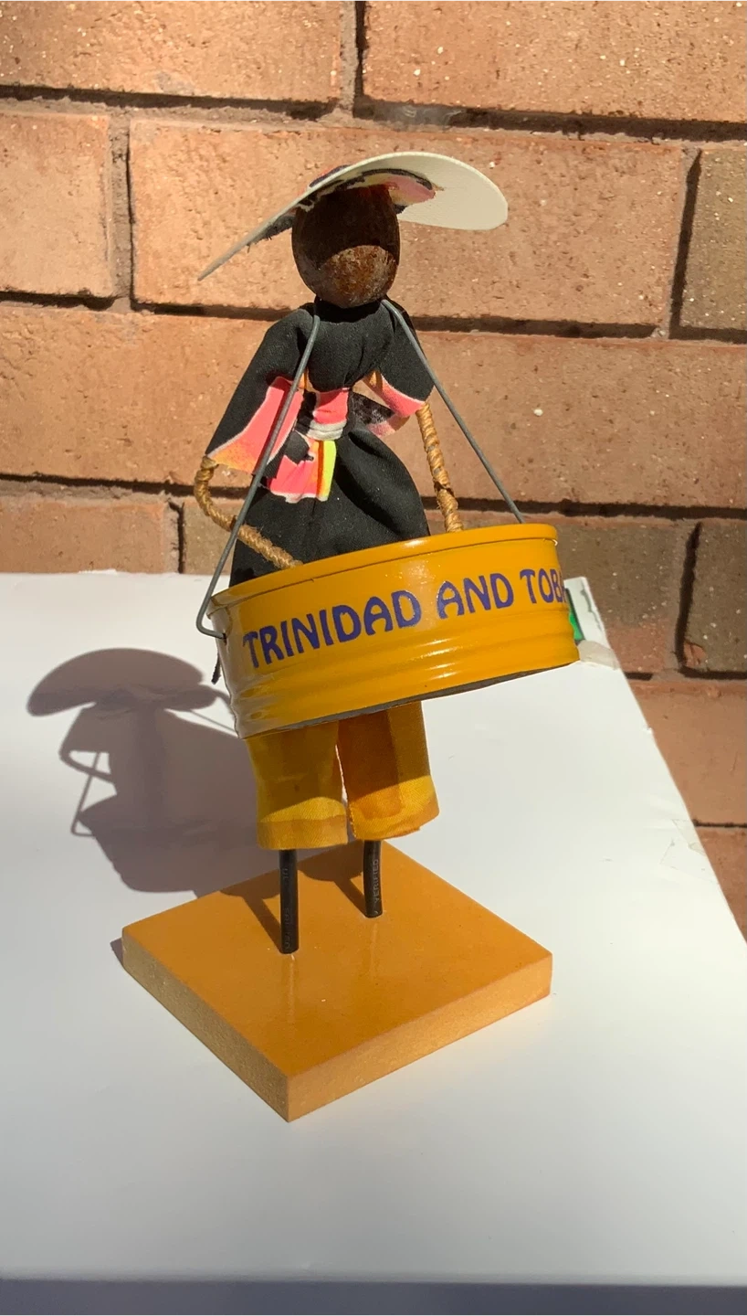 A unique souvenir doll featuring a figure carrying a yellow drum labelled "Trinidad and Tobago"! It's a charming piece to add to your collection or as a reminder of your travels 8 inches