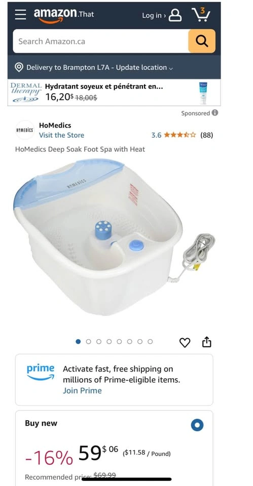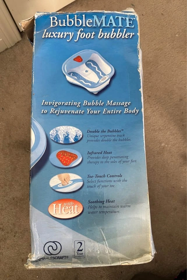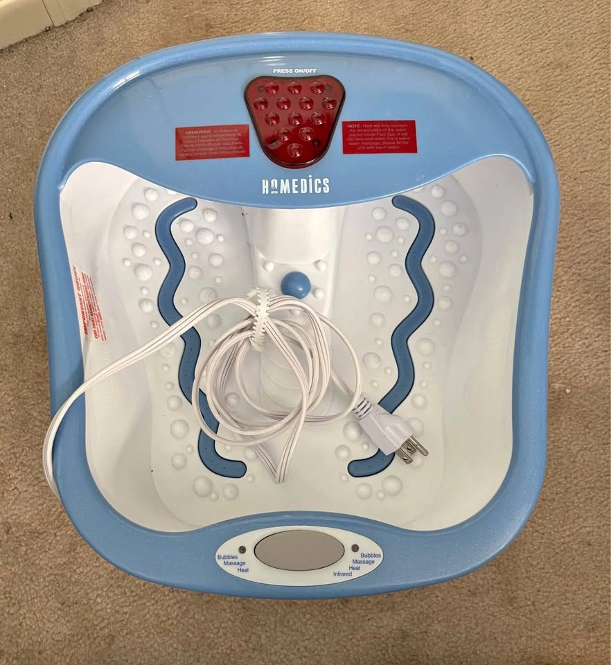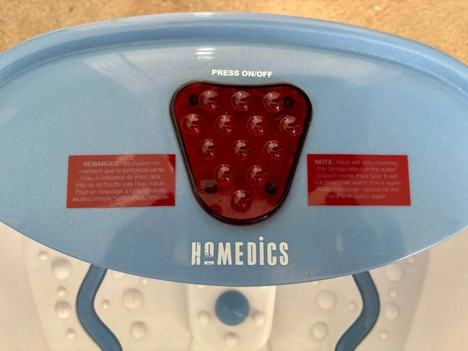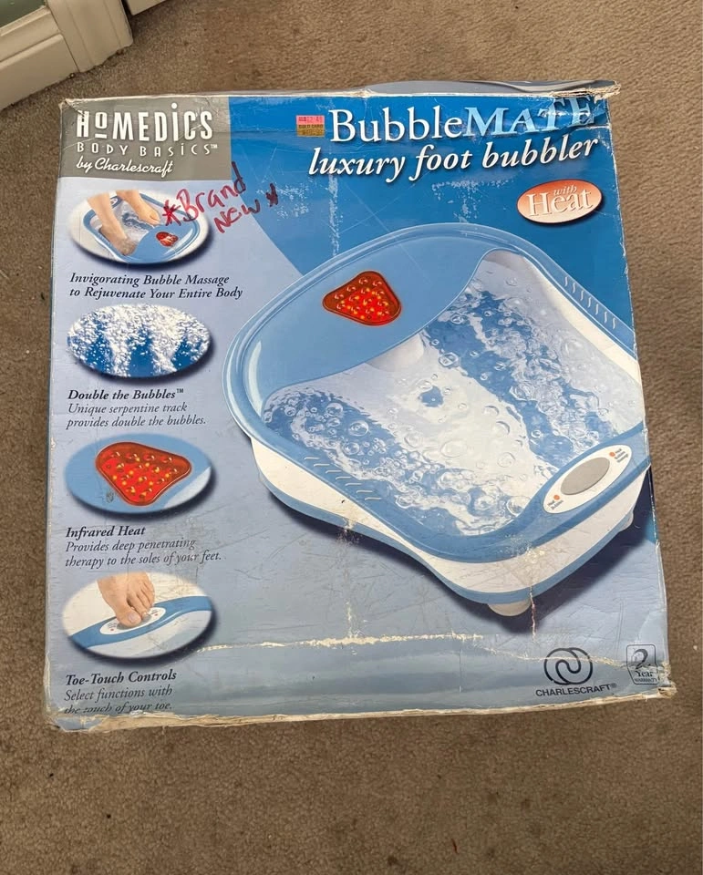 Homedics BubbleMate Luxury Foot Bubbler with Heat. Features bubble massage, infrared heat, and toe-touch controls. Includes power cord. Good condition with box (slightly damaged). For sale in Brampton near Fletchers Parkette.