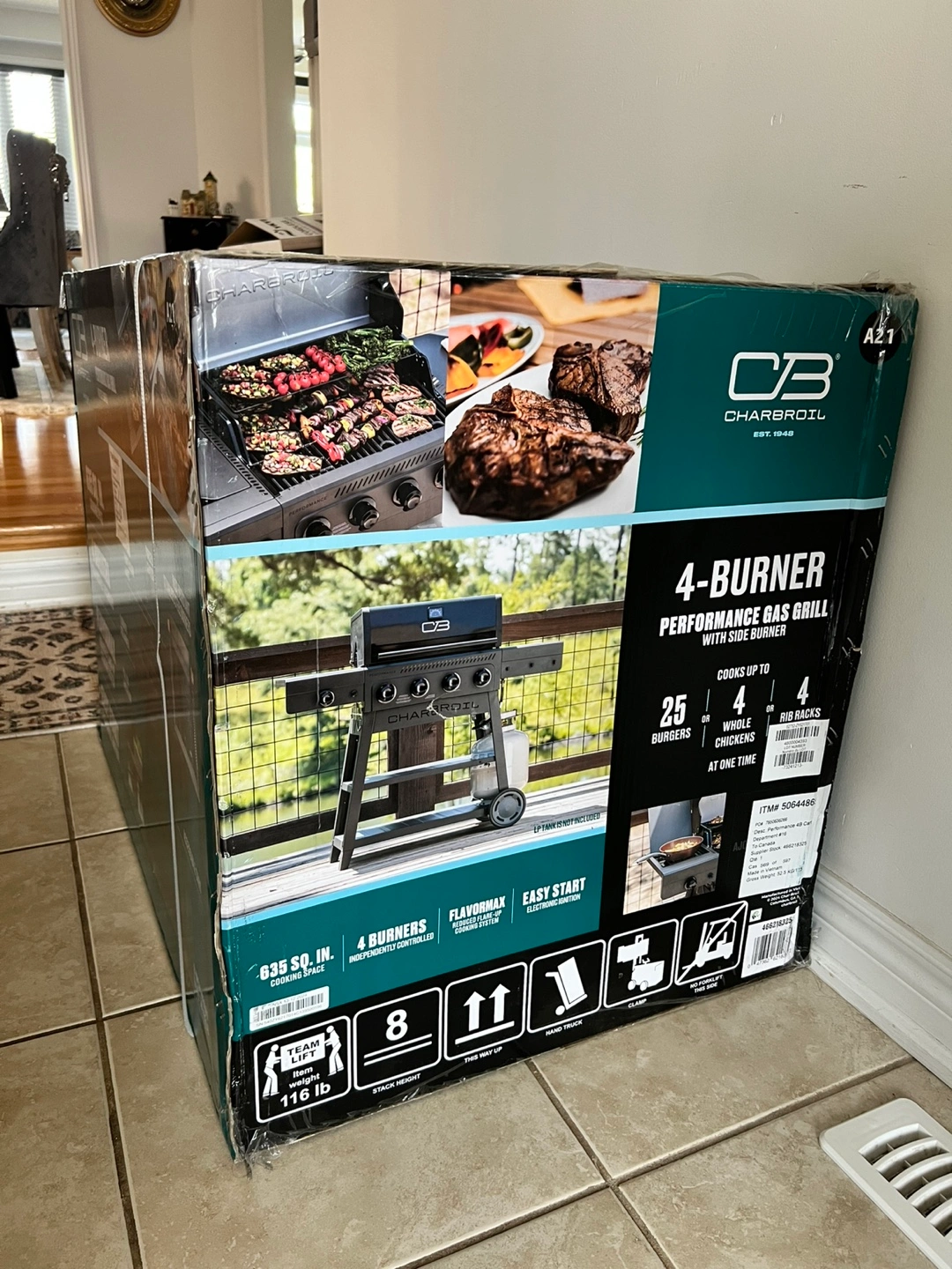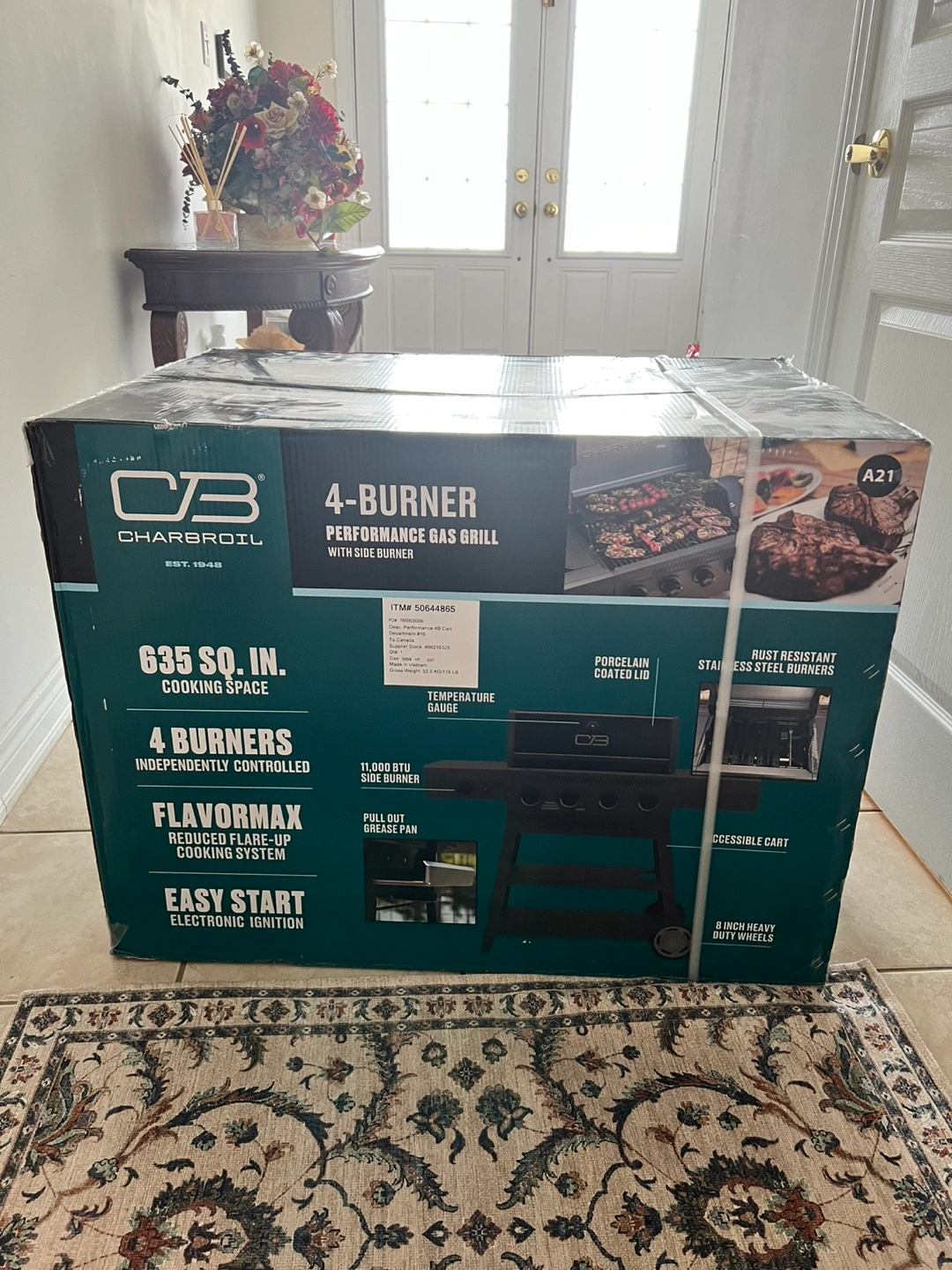 Selling a brand new Char-Broil 4-Burner Performance Gas Grill! It comes in the original box. This grill features: - 635 sq. in. cooking space - 4 burners, independently controlled - Flavormax reduced flare-up cooking system - Easy start electronic ignition - Porcelain coated lid - Rust resistant stainless steel burners - Pull out grease pan - Accessible cart