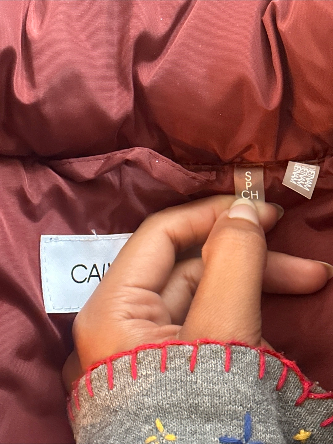 Cozy Calvin Klein puffer jacket in a lovely burgundy colour! It's a size small and perfect for staying warm on chilly days Buy for $30 Or Trading for: - office chair - storage pieces - text me what you’re willing to trade :)