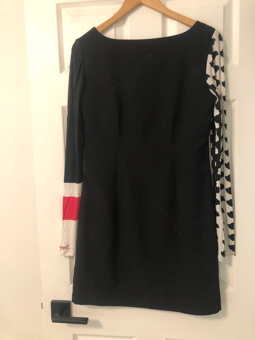 This Desigual dress is a size L and features a unique and eye-catching design. It has a mix of patterns and colours that make it stand out. Perfect for adding a bit of flair to your wardrobe!