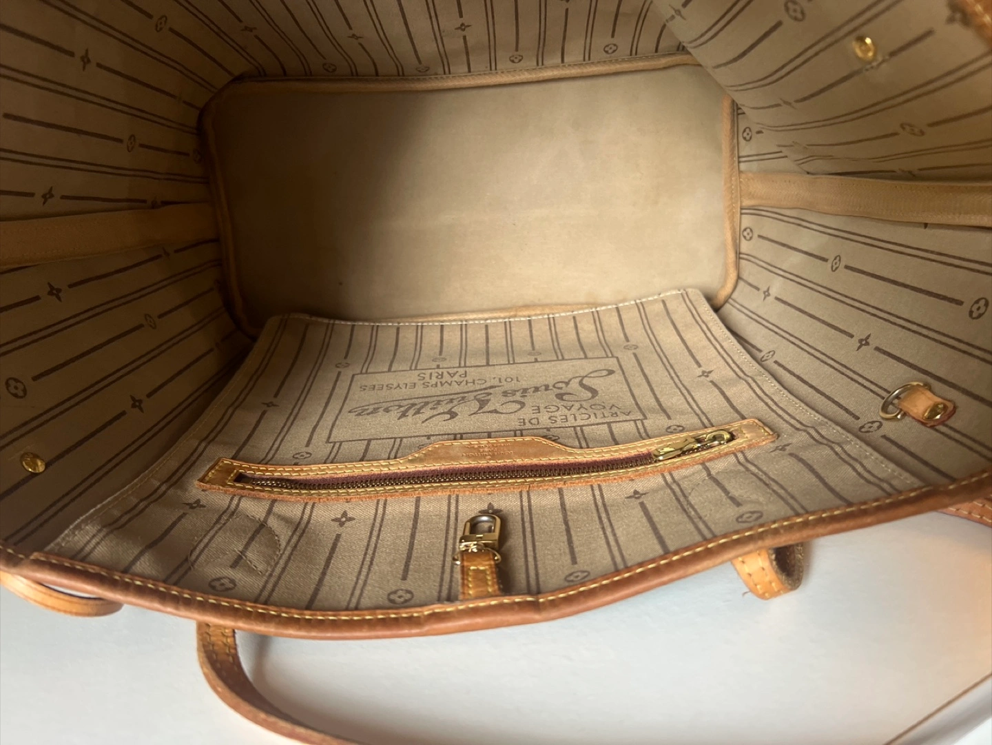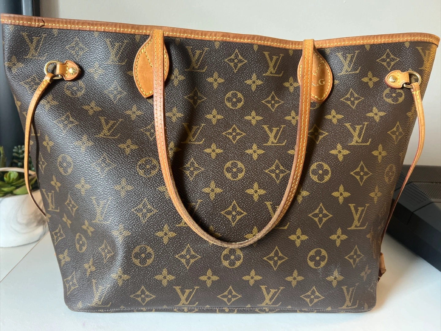 Selling a Louis Vuitton Neverfull MM tote bag. It features the classic LV monogram pattern. There are some signs of wear, particularly on the handles and trim, but it's still a beautiful and functional bag! As leather ages, it takes on a unique look that no other piece will have. Vintage leather goods. Well taken cared and comes with original dust bag