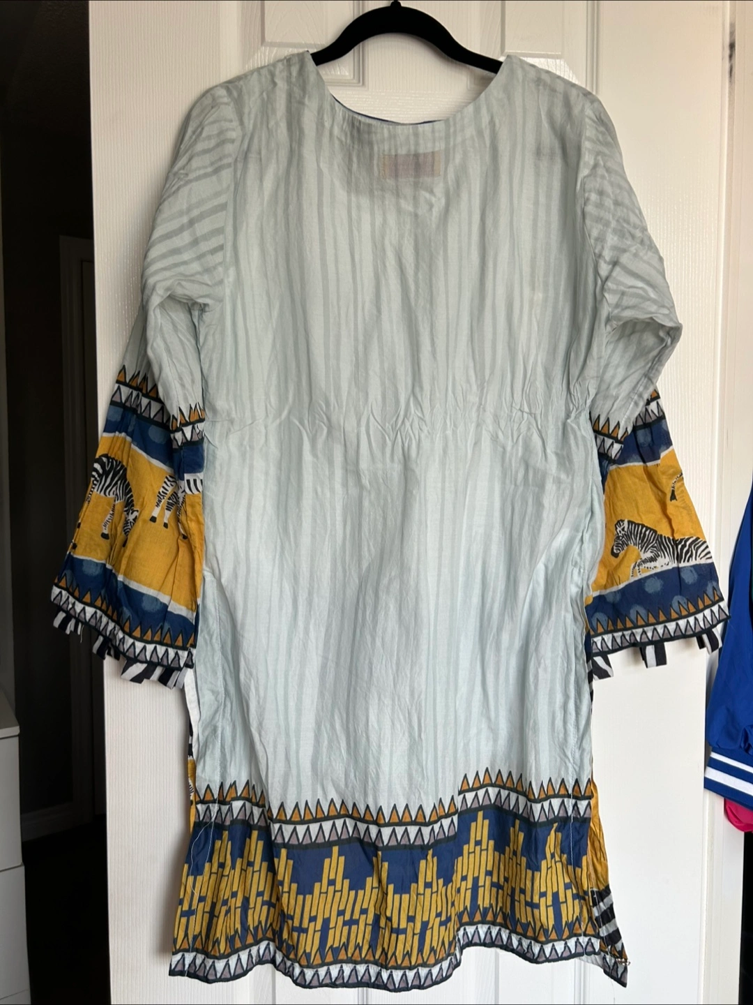 This long sleeve top features a unique design with zebra print details and geometric patterns in blue, yellow, and white. It's in great condition and ready for a new home!