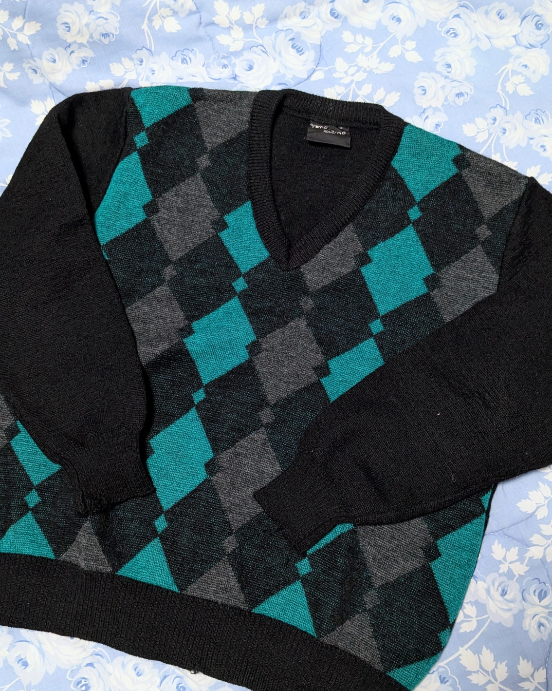 also OPEN TO TRADE! Selling a Farentino Roma sweater made of pure new wool. It features an argyle pattern in black, teal, and grey. Perfect for adding a touch of classic style to your wardrobe! Size small for men and medium for women! From a pet and smoke free home, pickup in Scarborough ๐