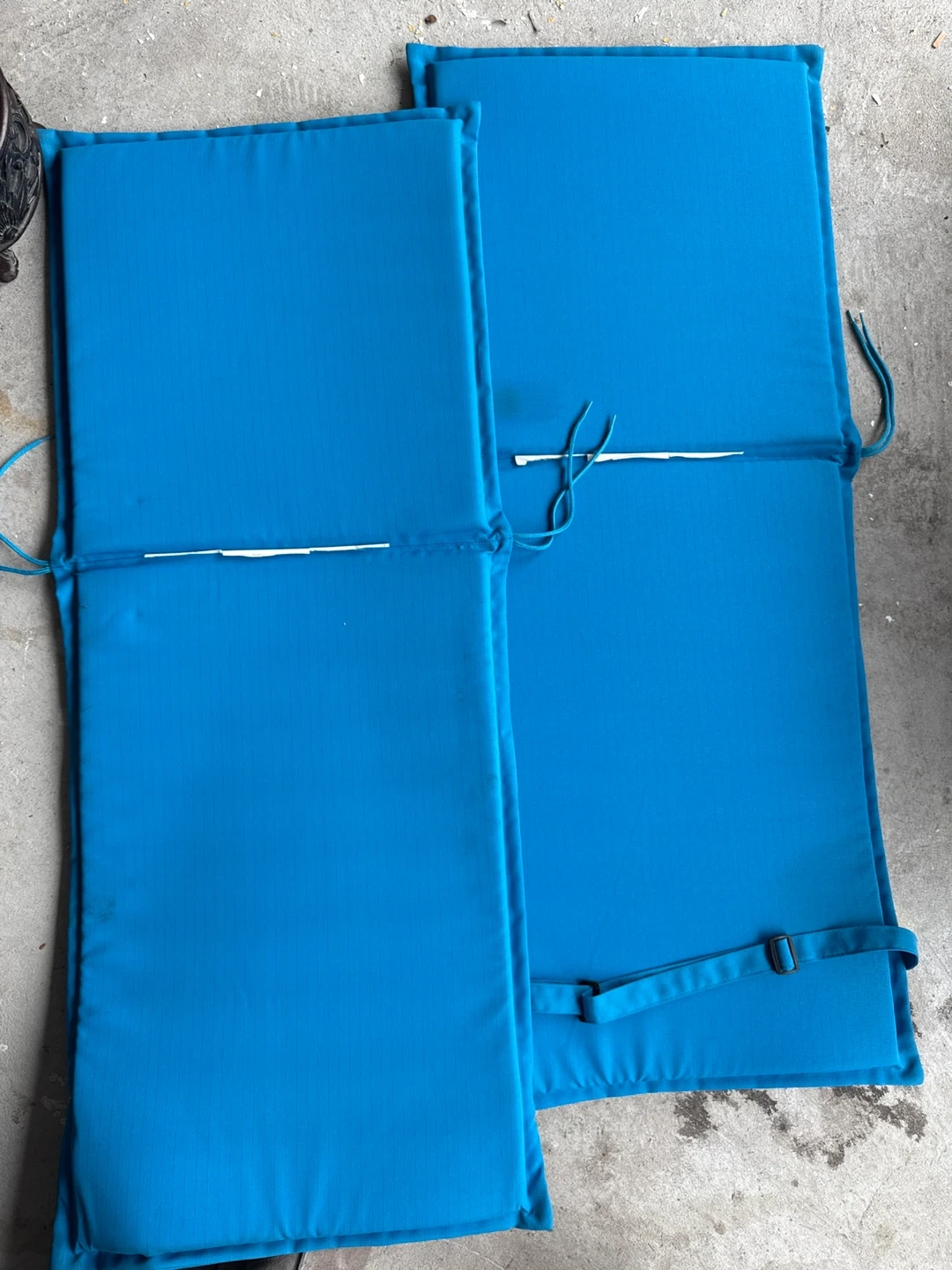 Selling a set of two outdoor chair cushions in a vibrant blue colour. They look to be in great condition and ready to add some comfort to your outdoor seating area!
