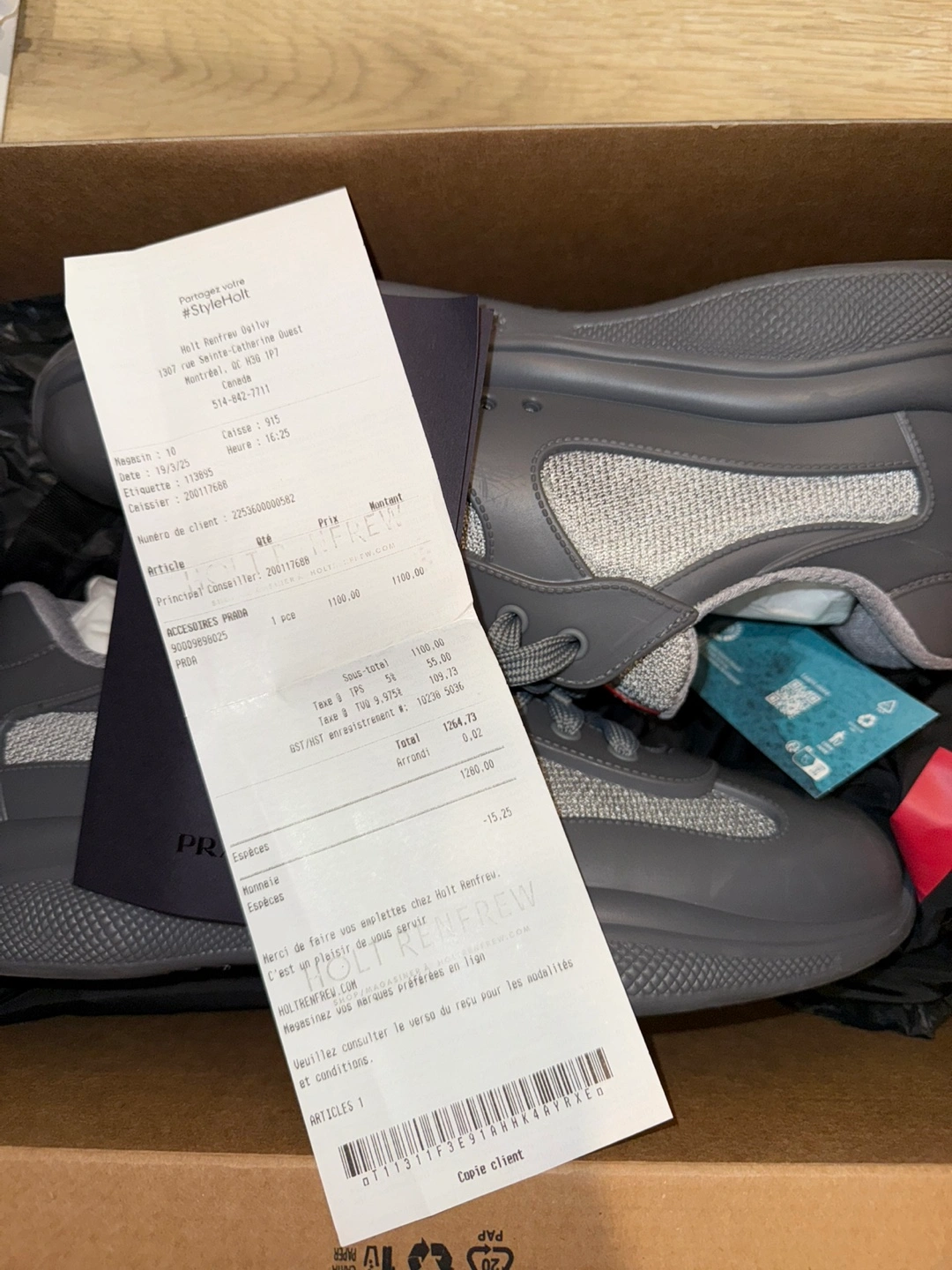 Selling a pair of Prada sneakers in a stylish grey colour. They are a size 10.5. These sneakers come with the box. Originally bought for $1100!