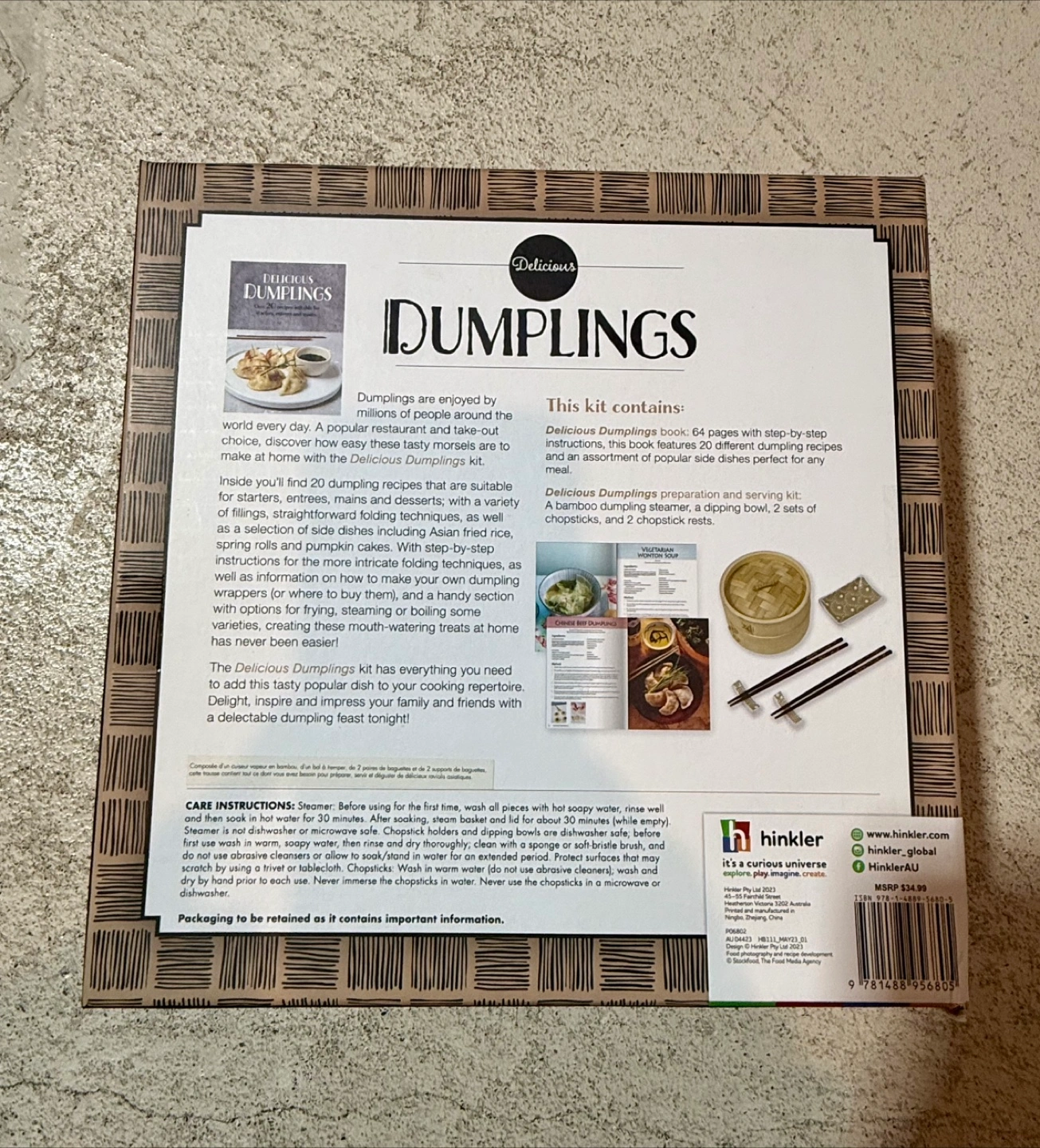 Everything you need to create and enjoy delicious dumplings! This kit contains a 64-page book with step-by-step instructions, 20 different dumpling recipes, a bamboo dumpling steamer, a dipping bowl, and 2 sets of chopsticks