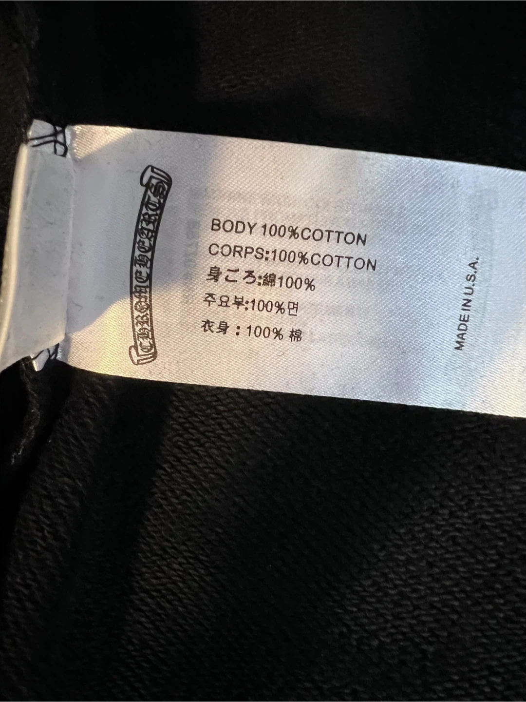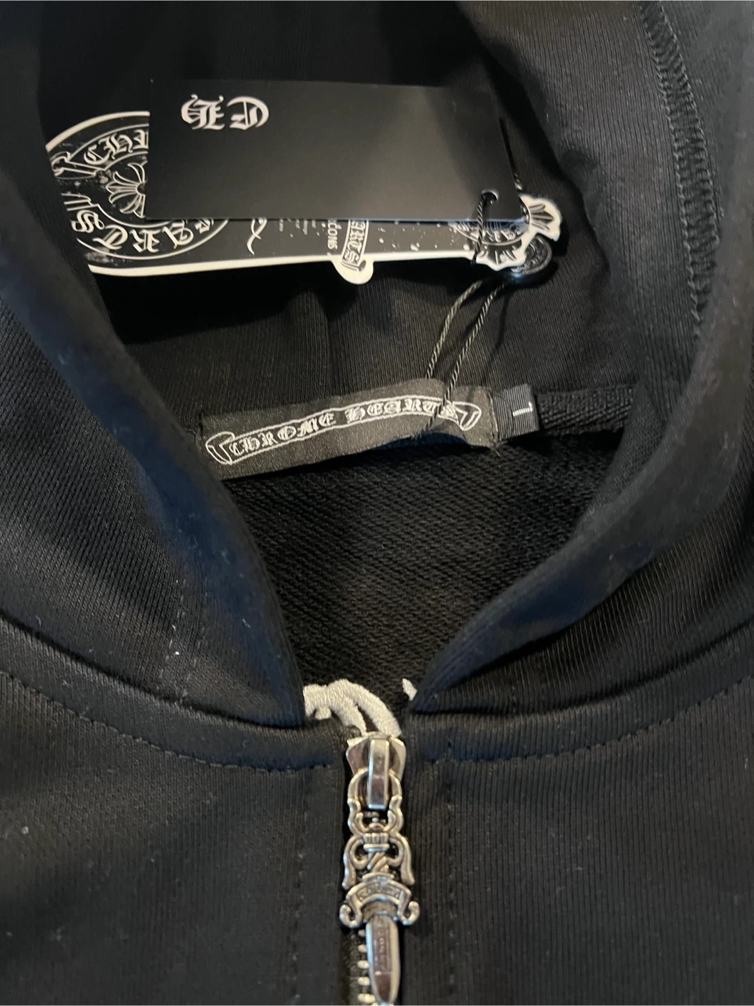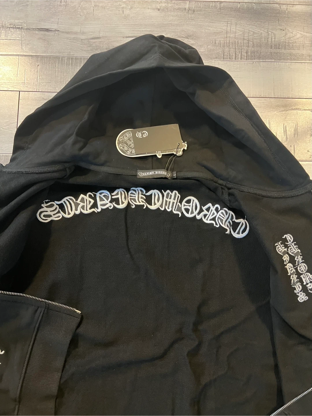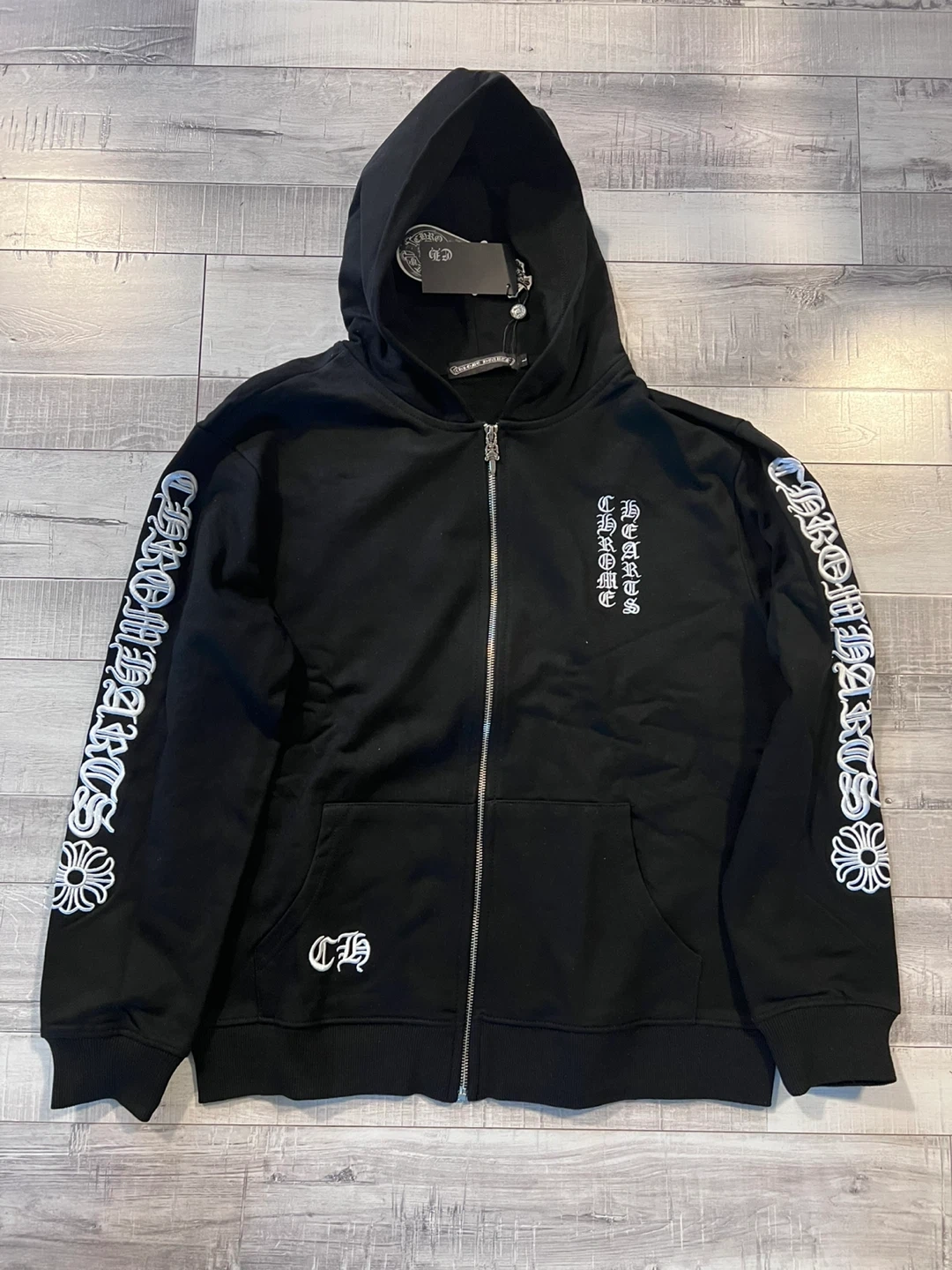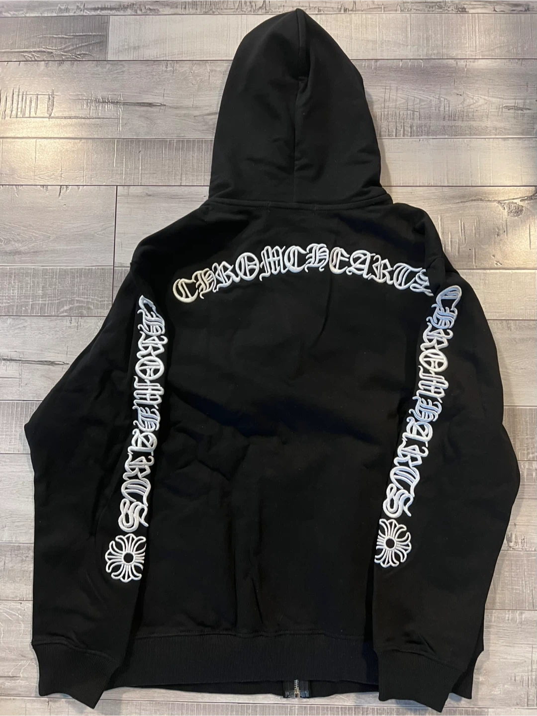 $130 Selling a Chrome Hearts hoodie in size large. It's black and made of 100% cotton. The hoodie features the Chrome Hearts logo and lettering on the sleeves and back. It's in great condition!