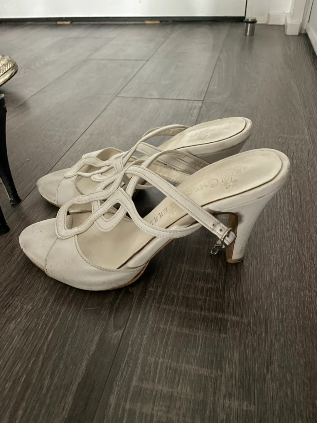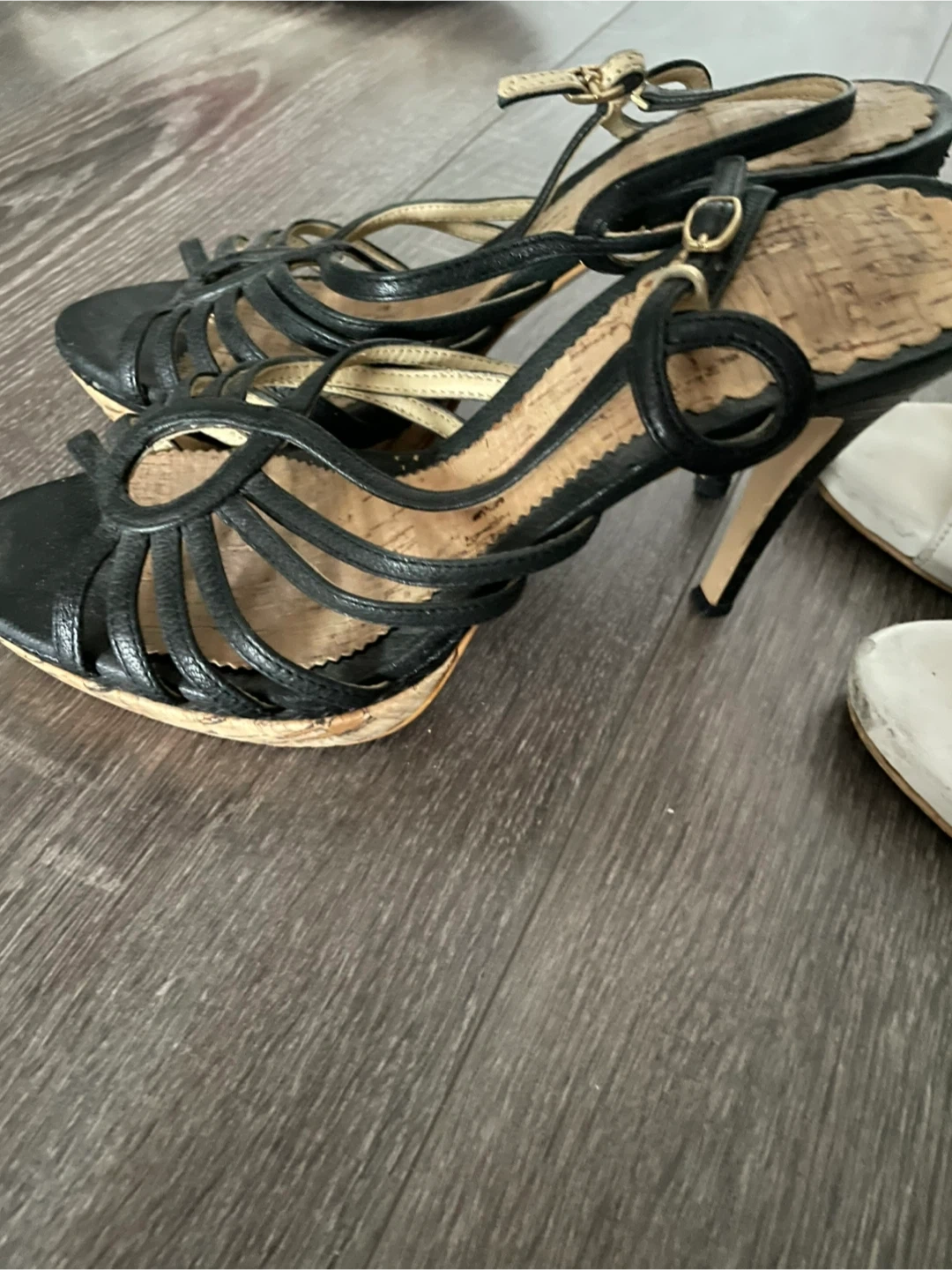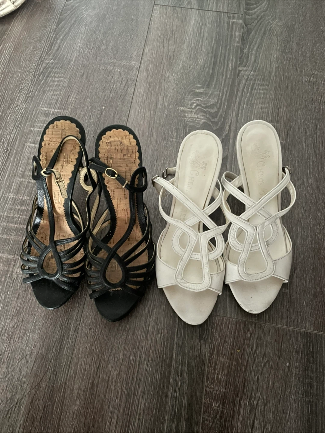 Selling two pairs of heels! One pair is black with cork detailing, and the other is white. Both have some wear and tear, but still have lots of life left in them. Perfect for adding a bit of height to any outfit!