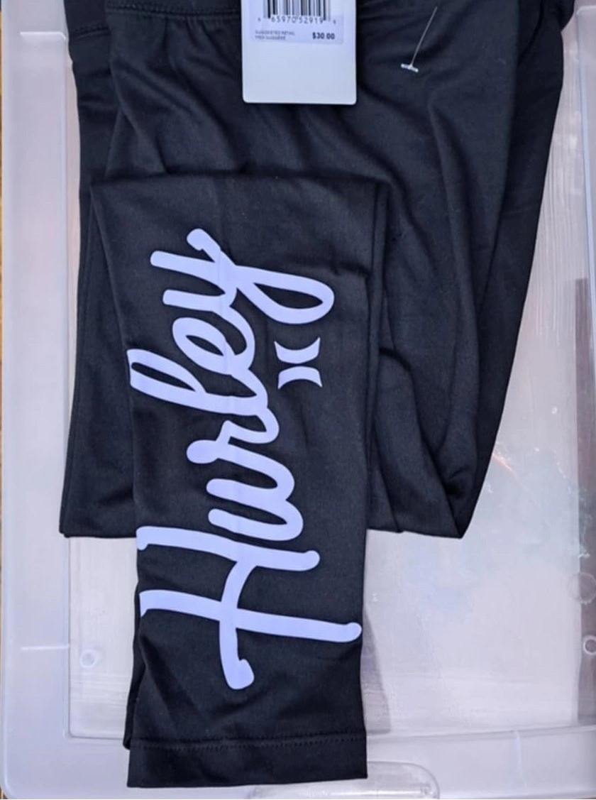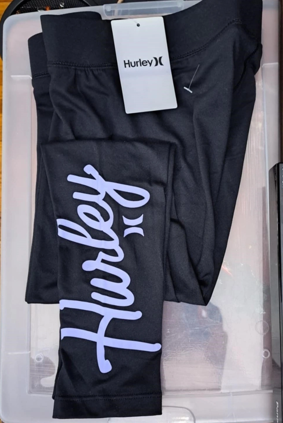 New Hurley Script Legging for Kids. Simple and comfortable.. The stretchy fabric allows for all kinds of movement and is soft enough to wear while just hanging out. These leggings feature: Hurley script on left leg, Elastic waistband. Skinny leg. Made of 92% Polyester / 8% Elastane