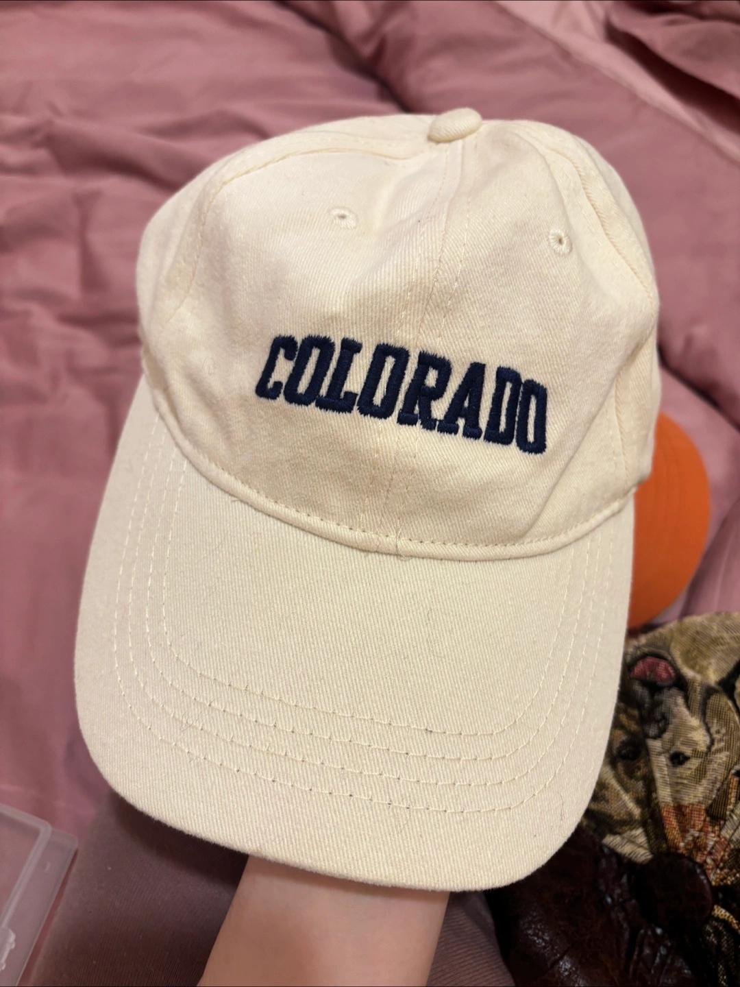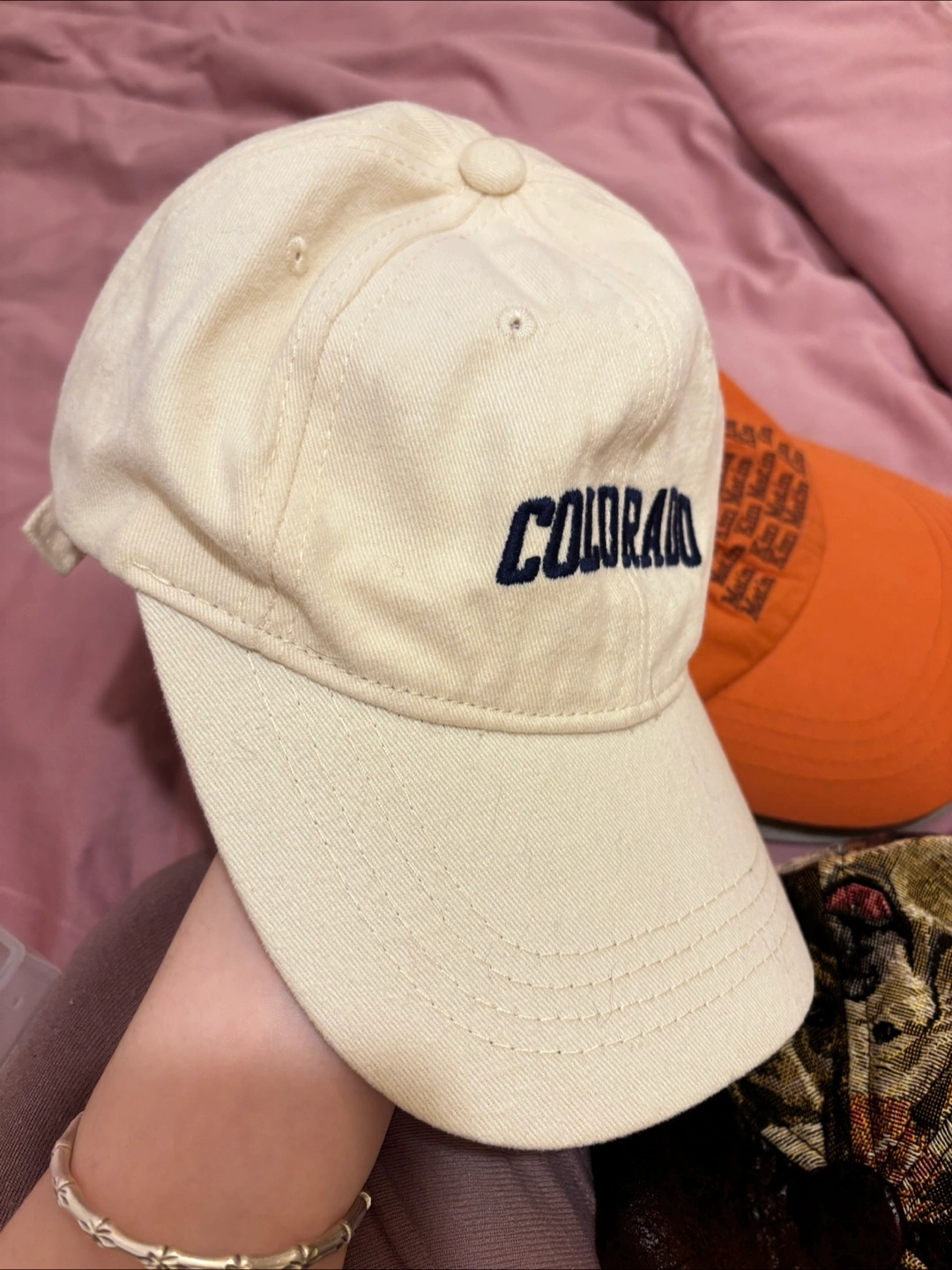 Selling a cream-coloured baseball cap with 'COLORADO' embroidered on the front!