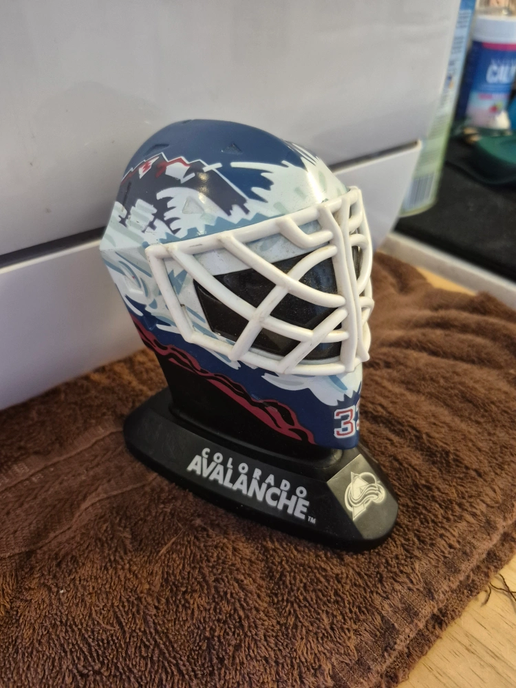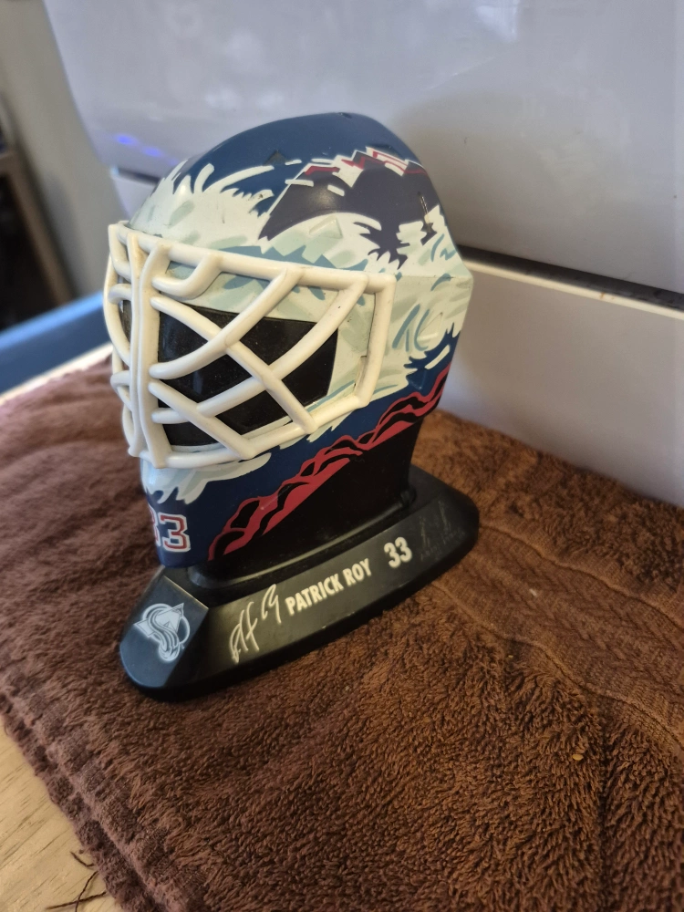 Selling a collectible Patrick Roy goalie mask. It features the Colorado Avalanche logo and Roy's signature. Great for any hockey fan!