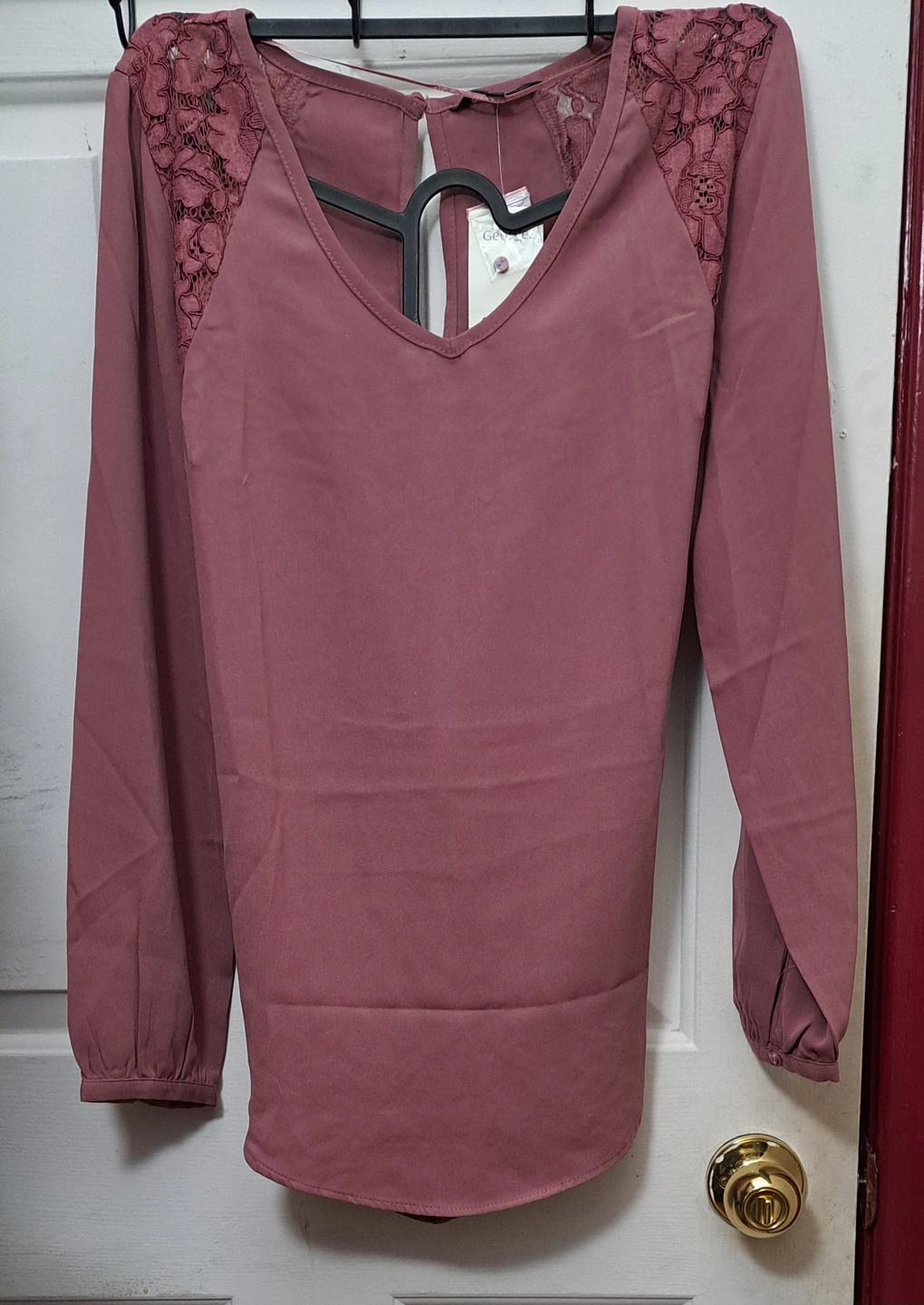 This stylish, beautiful feminine blouse is made from soft polyester fabric, featuring a decorative lace trim around the yoke at the upper part of the blouse, at the shoulder. It is suitable for both formal and informal attire.