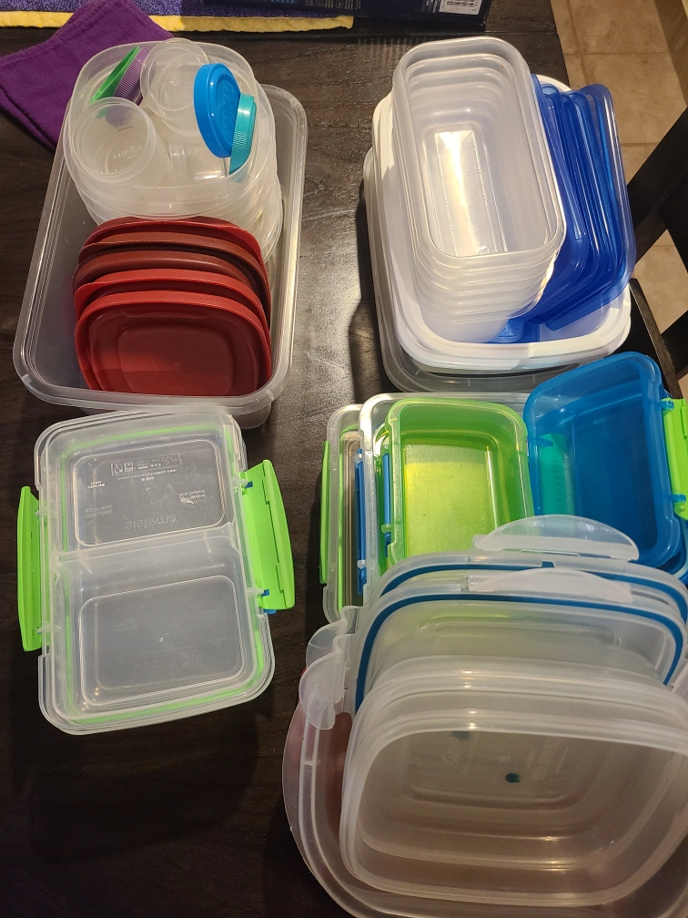 Gifting a mixed lot of food storage containers! There are various shapes and sizes, with different coloured lids like red, blue, and green. Great for meal prepping or storing leftovers. Some are Sistema brand.