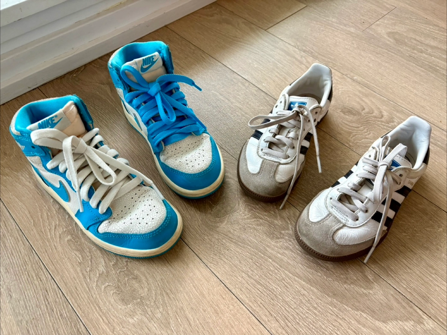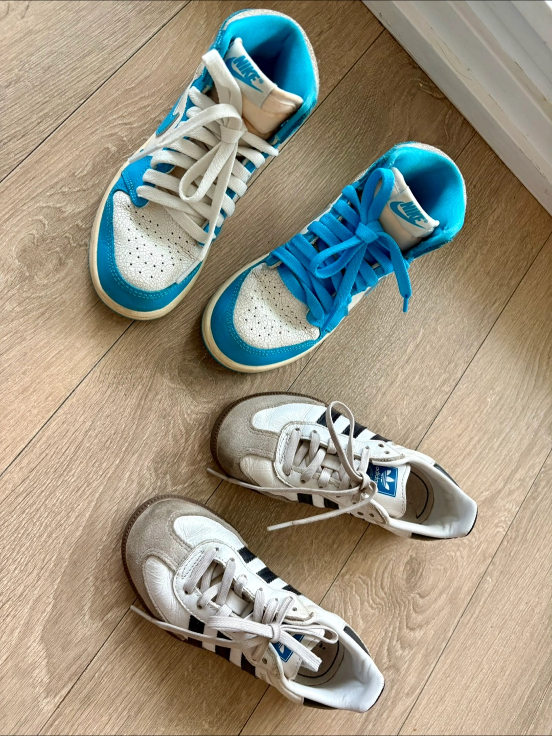 Selling a bundle of two pairs of shoes! One pair is a blue and white Nike high top sneaker, and the other is a pair of Adidas Samba sneakers in white and grey. Both are in used condition but have lots of life left! Samba is size 12, blue shoes are 12.5